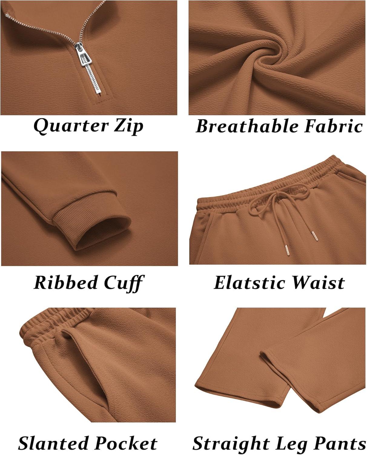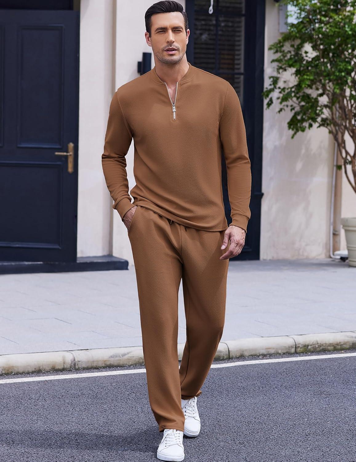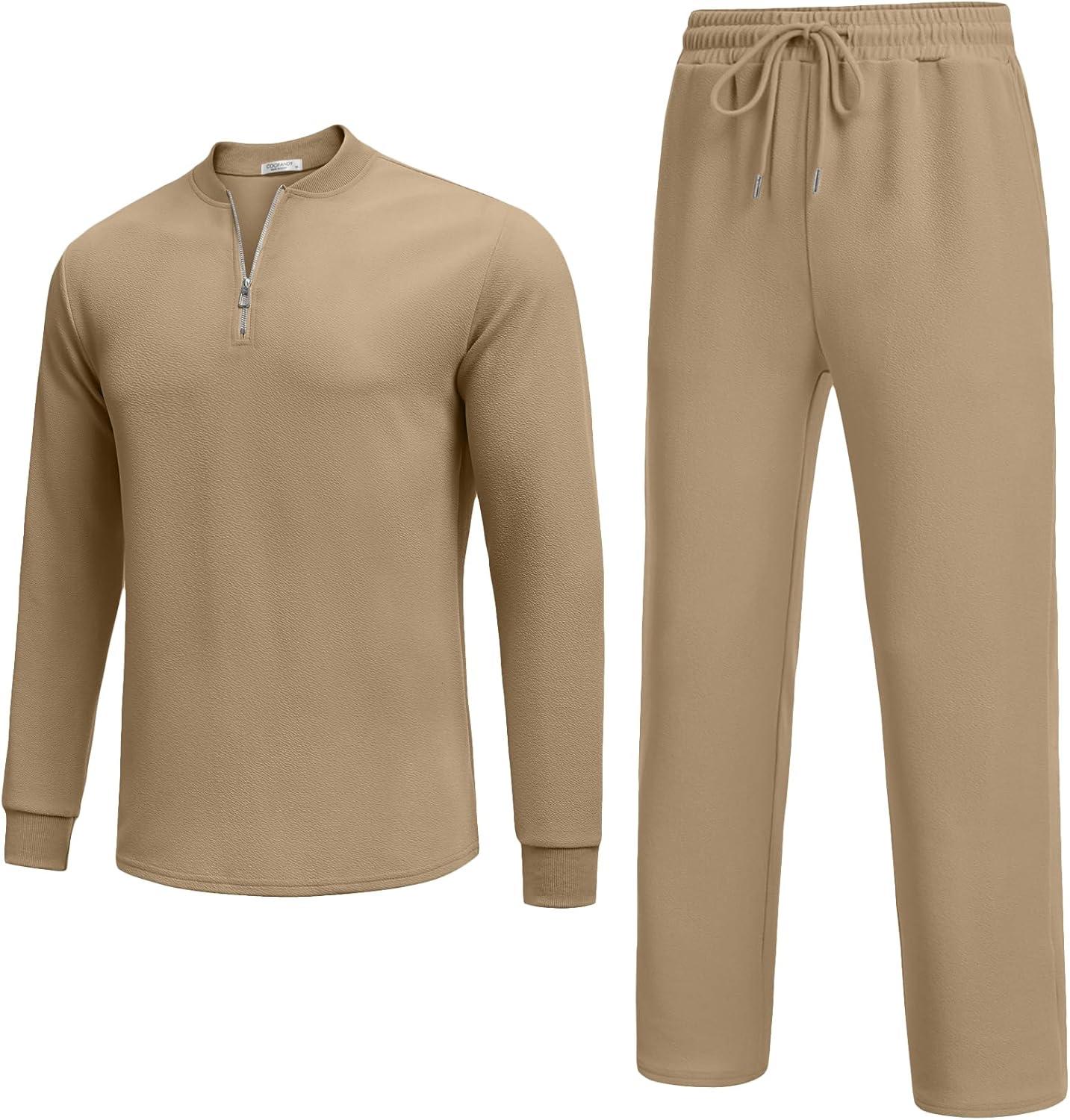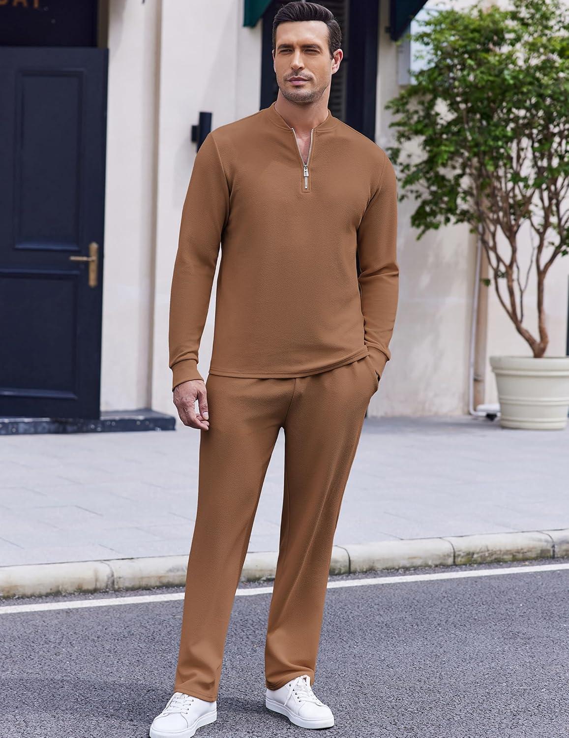 COOFANDY Men’s 2 Piece Tracksuit Set Polo Athletic Sweatsuit Quarter Zip Jogging Long Sleeve Casual Sports Outfits(Light Brown)