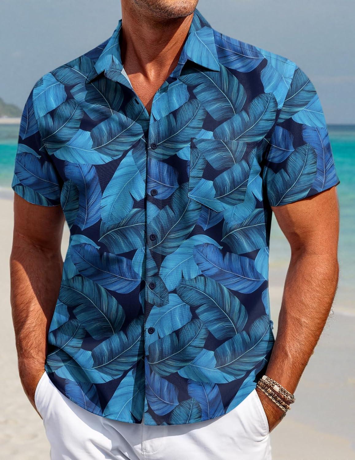 COOFANDY Hawaiian Short Button Sleeve Down Shirt Shirts Beach(Leaf-bright Blue)