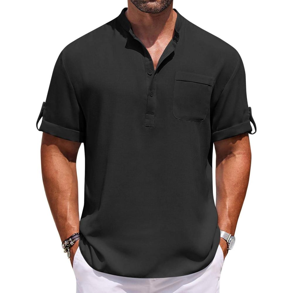 COOFANDY Henley Shirts for Men Short Sleeve Band Collar Casual Shirt Summer Hippie Vacation Beach T Shirts with Pocket(Black)