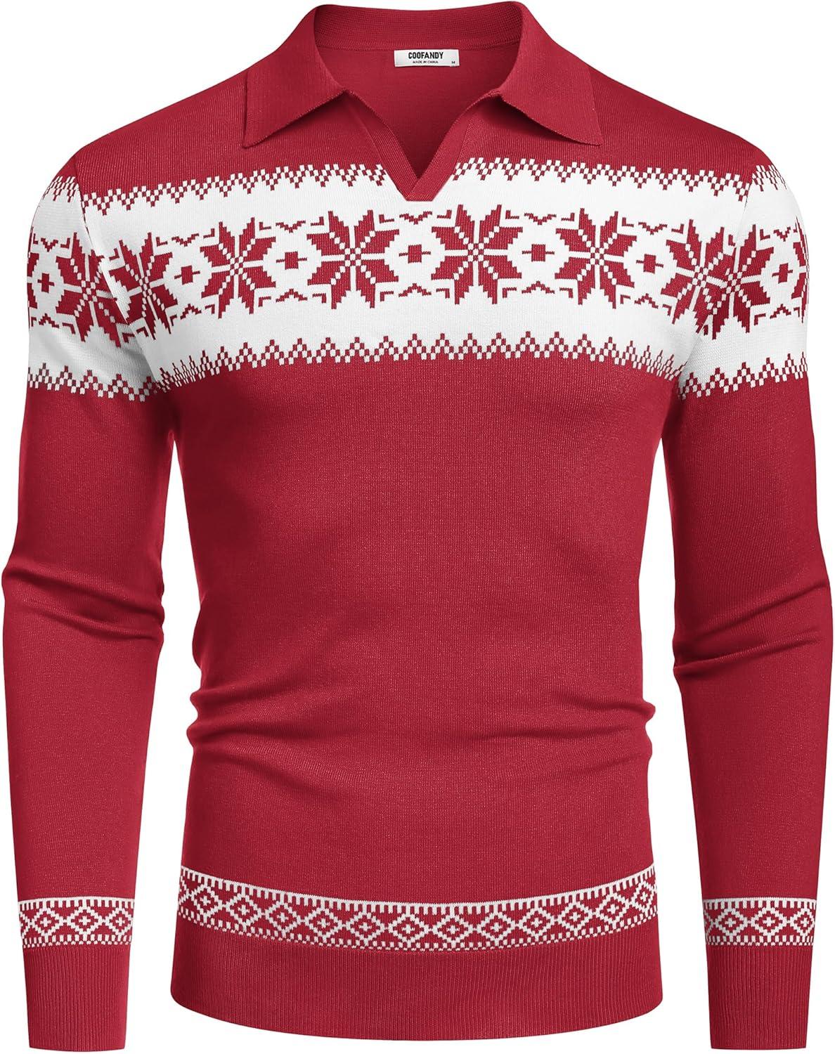COOFANDY Long Sleeve Polo Shirts for Men Knit Polo Sweater Lightweight Ribbed Pullover Sweater(Christmas Red & White)