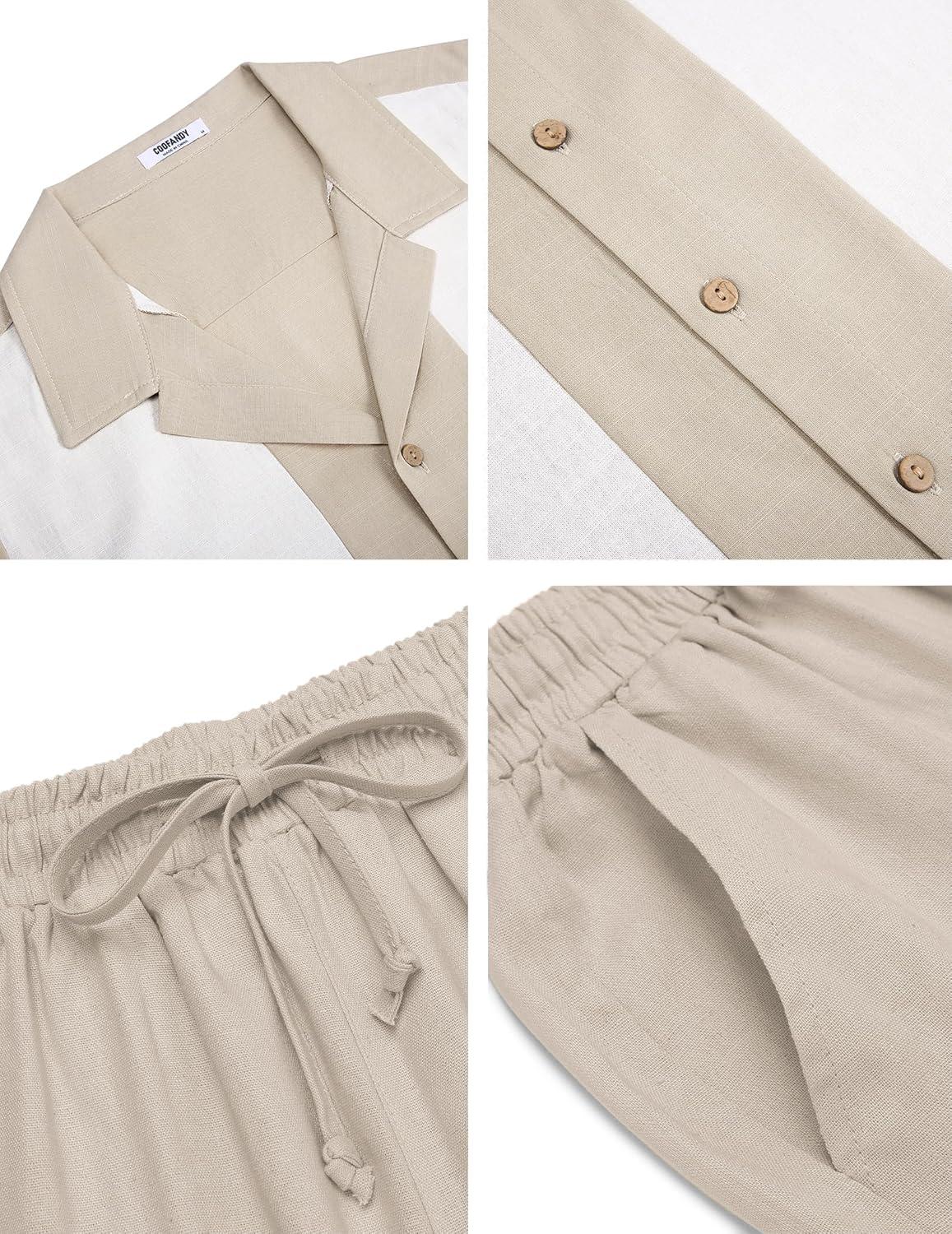 COOFANDY Men 2 Piece Linen Outfit Beach Button Down Shirt Casual Loose Pant Sets(Khaki Patchwork White Shirt/Khaki Pants)