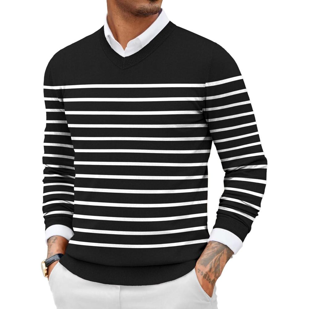 COOFANDY Men Casual V Neck Sweater Ribbed Knit Slim Fit Long Sleeve Pullover Top(Black-white)