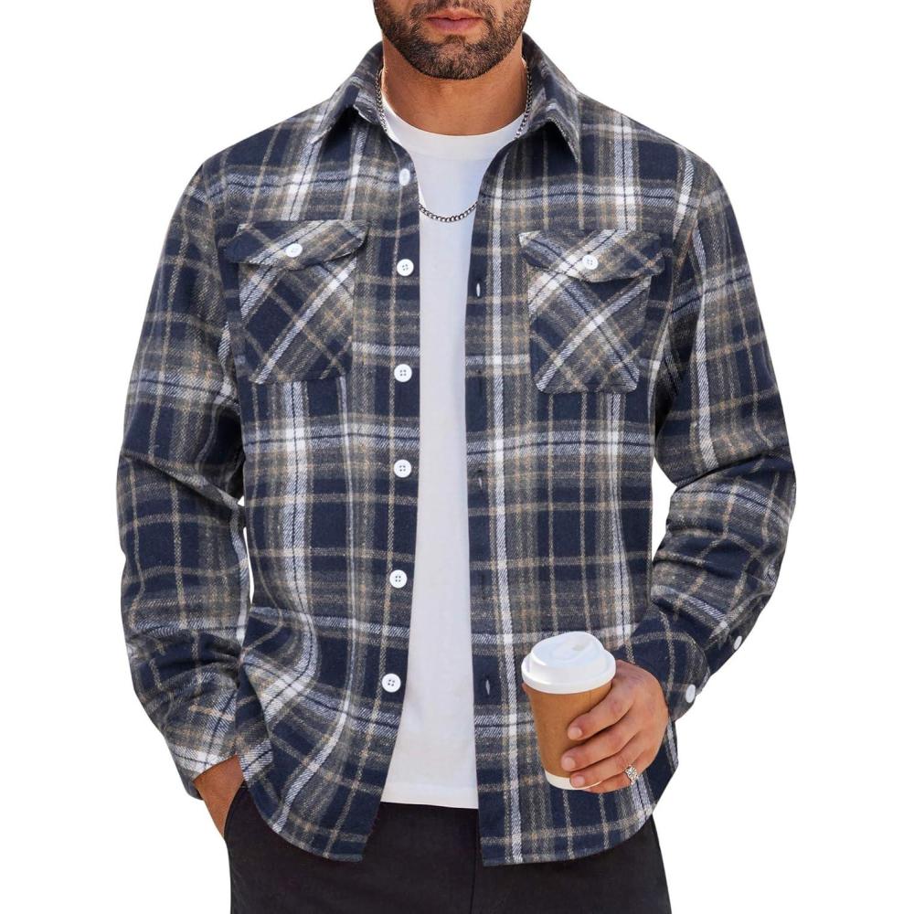 COOFANDY Men Flannel Shirt Casual Button Down Shirt Jacket Long Sleeve Plaid Shirts with Pockets(Dark Blue)
