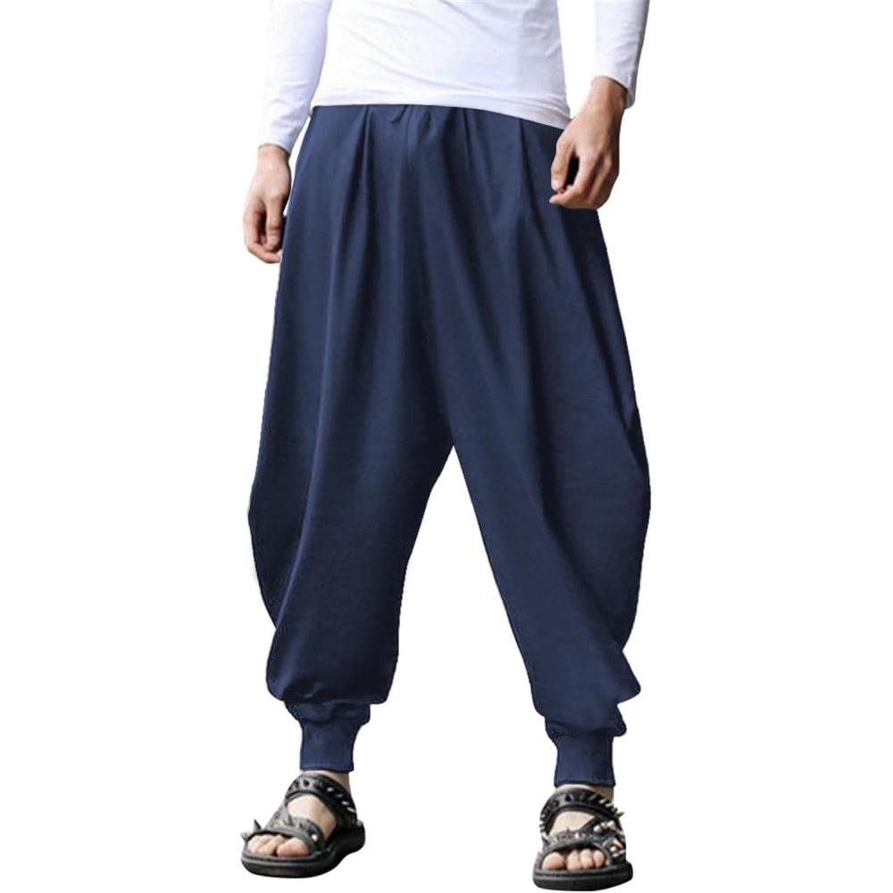 COOFANDY Men Hippie Harem Pants Baggy Linen Cotton Boho Yoga Pants Summer Beach Pants Casual Drop Crotch Trouser(Pure Blue)