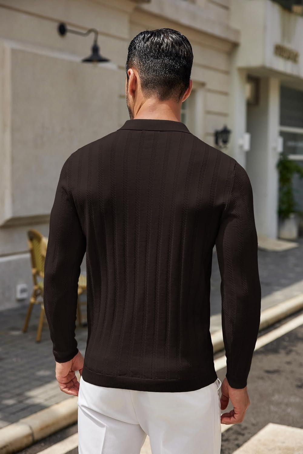 COOFANDY Men Knit Long Sleeve Polo Shirts Casual Dress Collared Sweater Pullover Button Down Golf Polo Shirts(Brown)