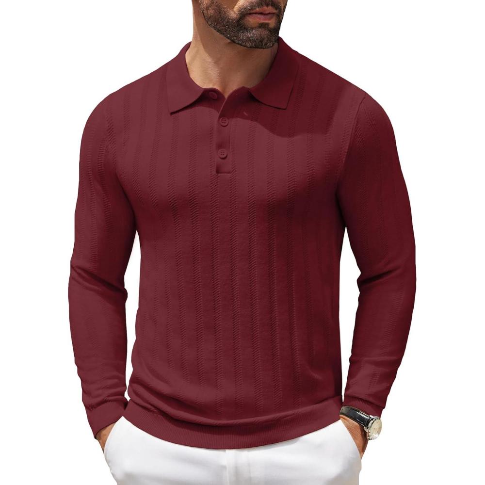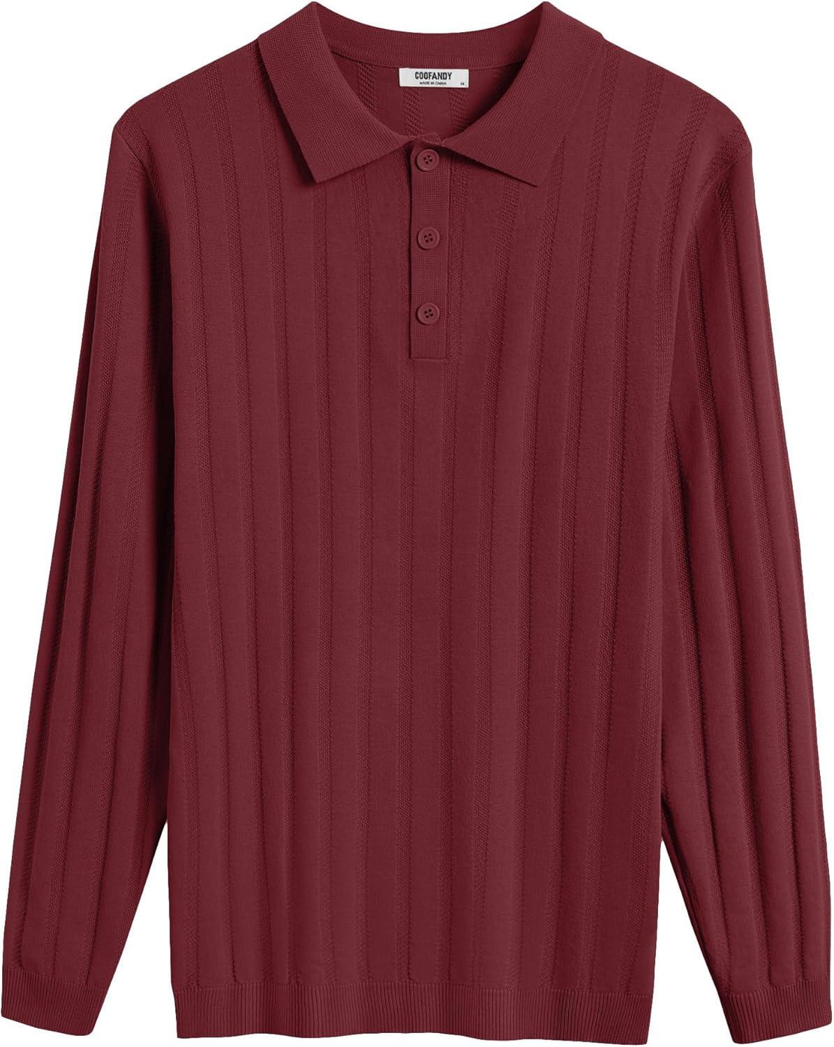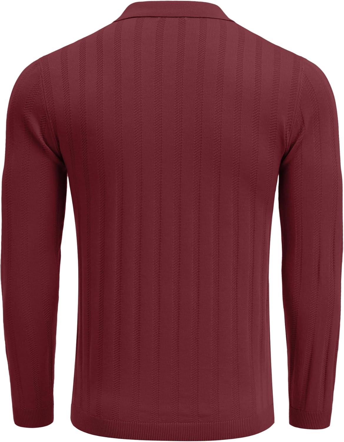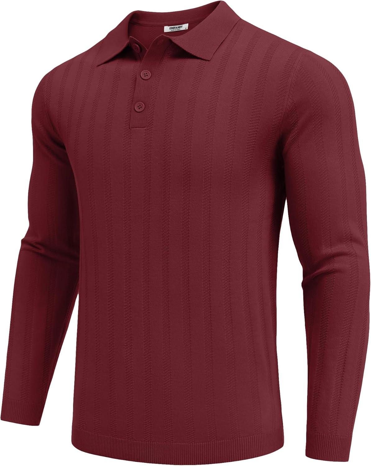 COOFANDY Men Knit Long Sleeve Polo Shirts Casual Dress Collared Sweater Pullover Button Down Golf Polo Shirts(Wine Red)