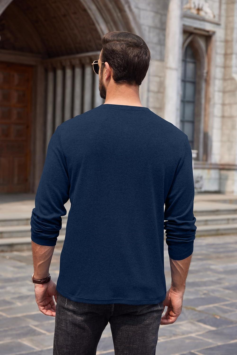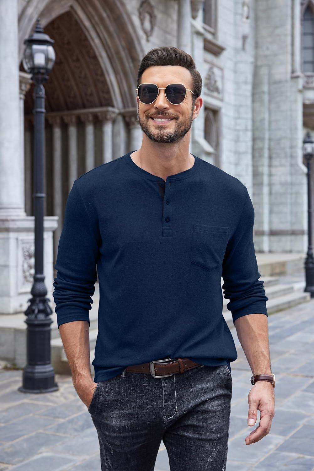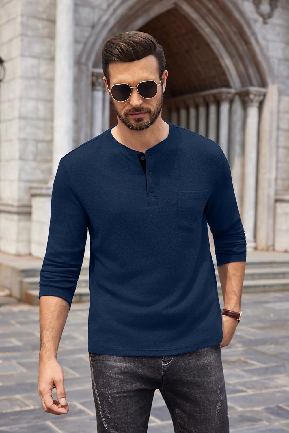 COOFANDY Men Long Sleeve Henley Shirs Casual Basic T Shirts Soild Button Tees with Pockets(Navy Blue)