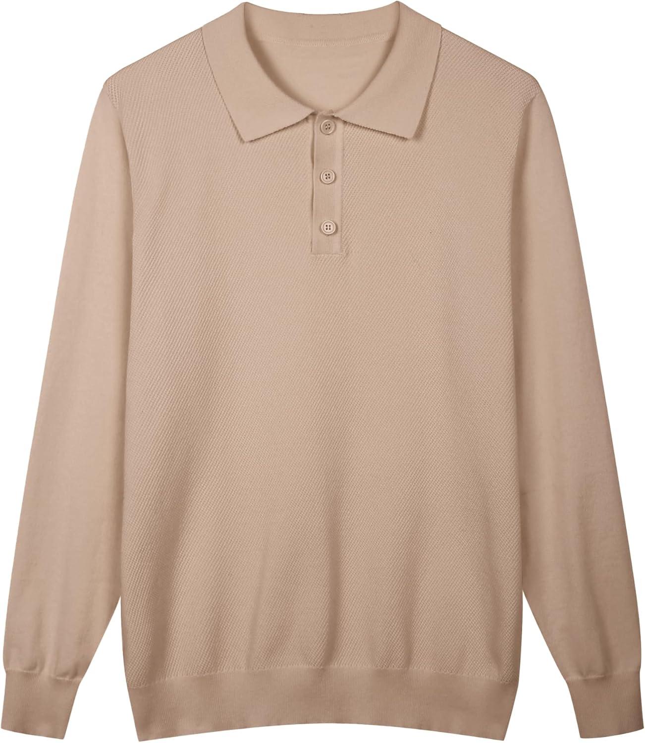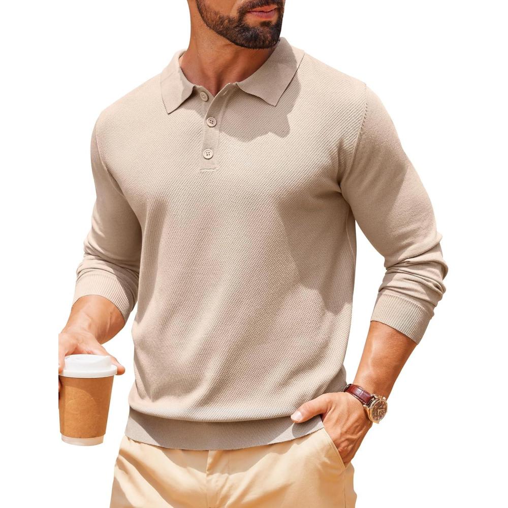 COOFANDY Men Long Sleeve Polo Sweater Knitted Polo Slim Fit Waffle Collared Pullover Sweater(Khaki)