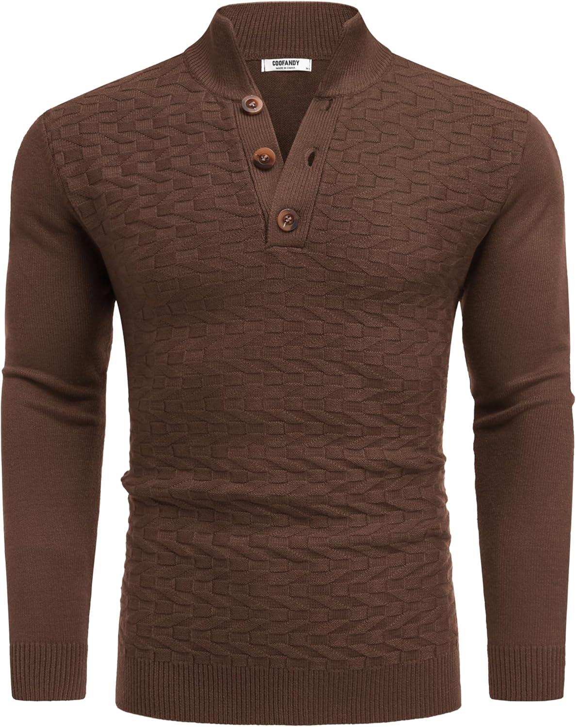 COOFANDY Men Mock Neck Button Sweater Casual Knitted Sweaters Fashion Henley Sweater(Brown)