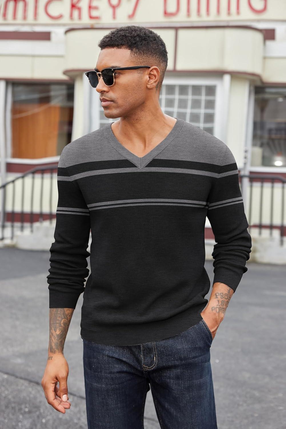 COOFANDY Men V Neck Dress Sweater Knit Long Sleeve Casual Slim Fit Pullover Sweater(Black & Dark Heather Grey)
