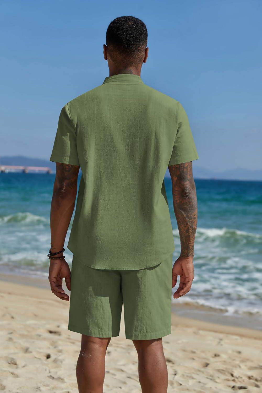 COOFANDY Men’s 2 Piece Cotton Linen Sets Summer Beach Outfits Casual Short Sleeve Henley Shirts and Vacation Shorts(Army Green)