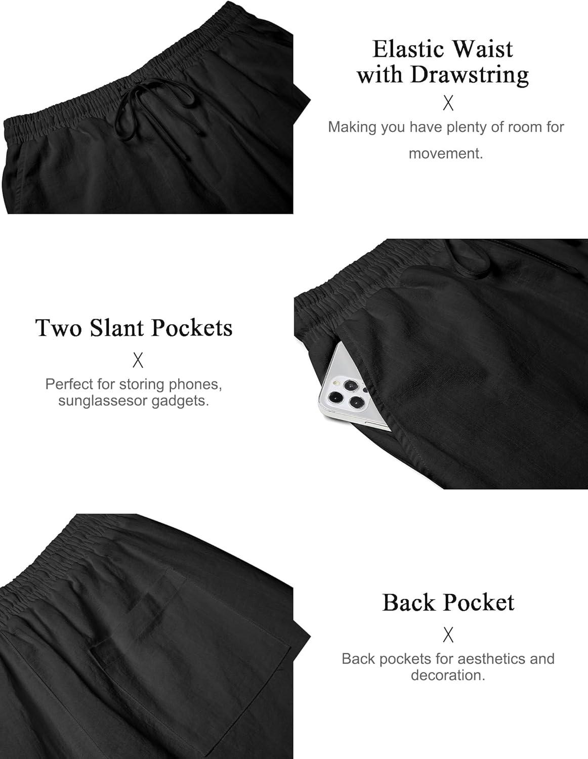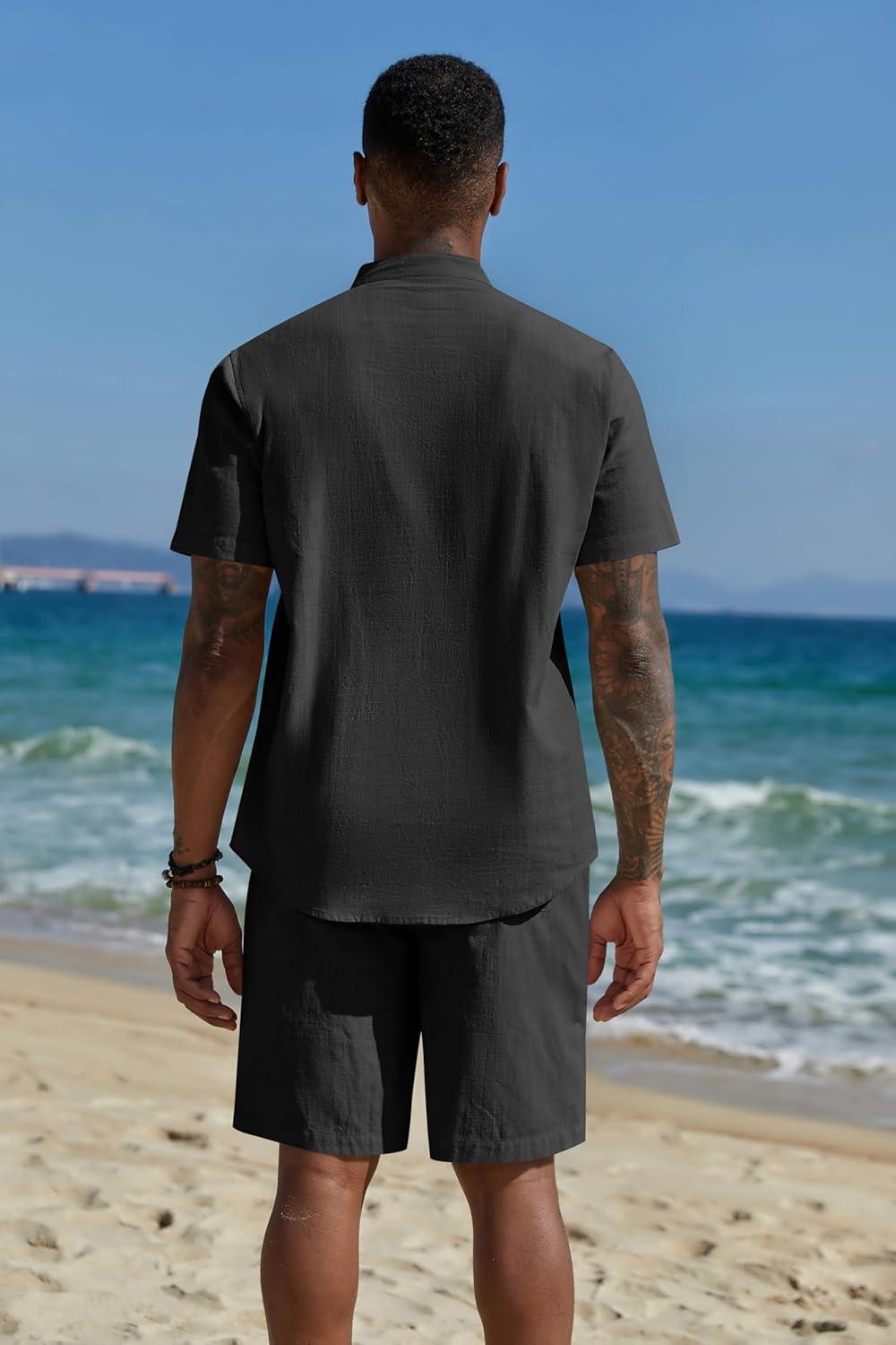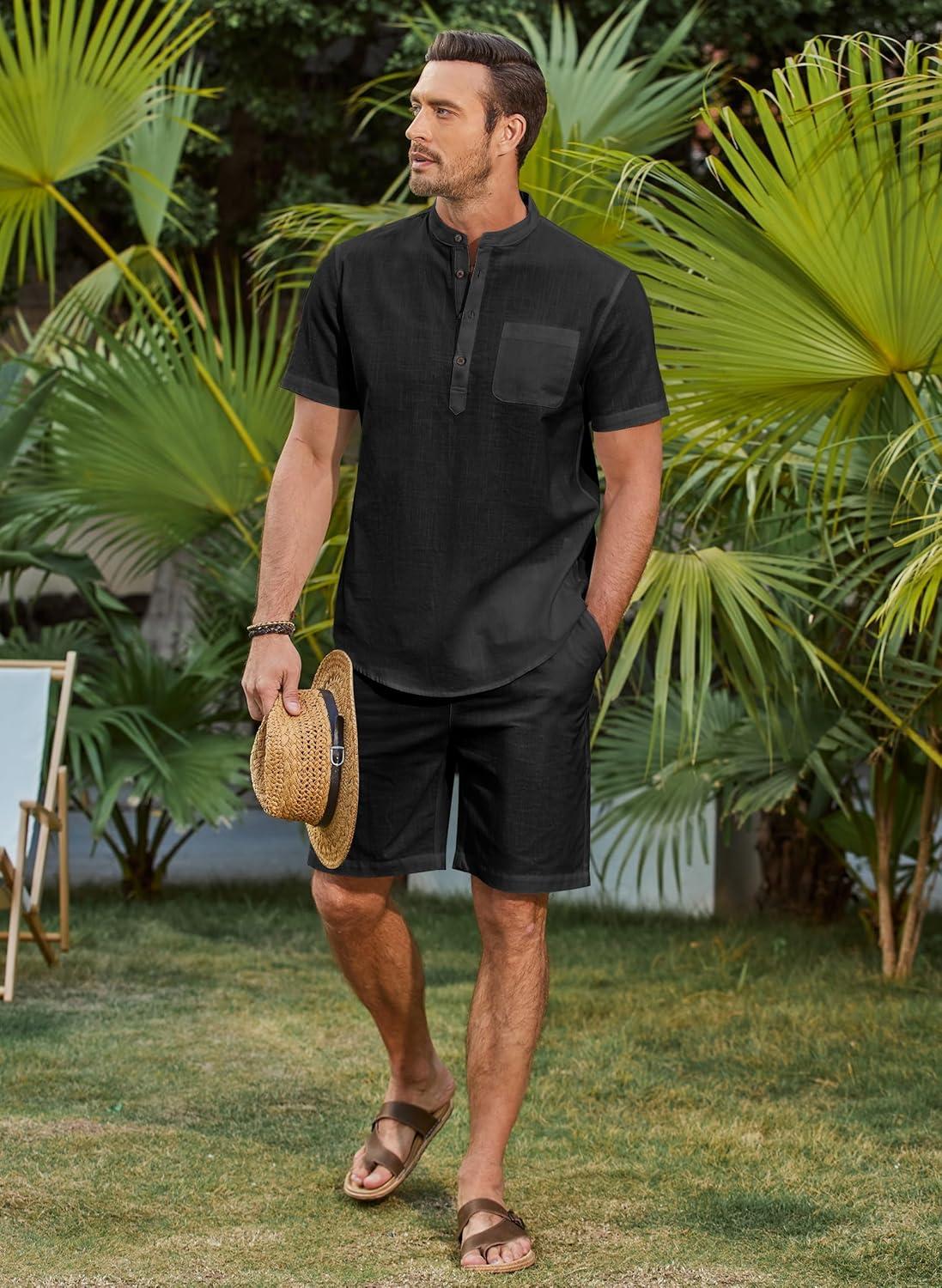 COOFANDY Men’s 2 Piece Cotton Linen Sets Summer Beach Outfits Casual Short Sleeve Henley Shirts and Vacation Shorts(Black)
