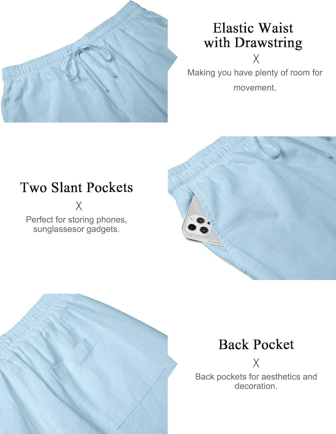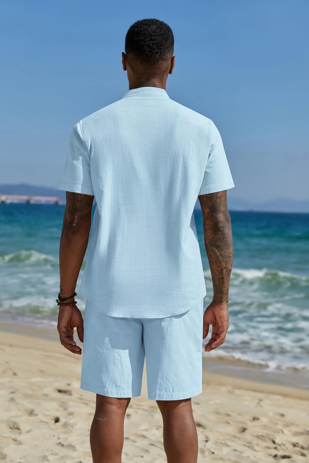 COOFANDY Men’s 2 Piece Cotton Linen Sets Summer Beach Outfits Casual Short Sleeve Henley Shirts and Vacation Shorts(Blue)