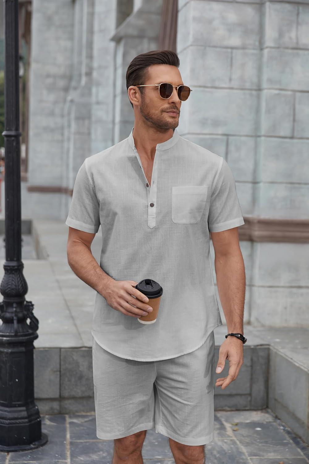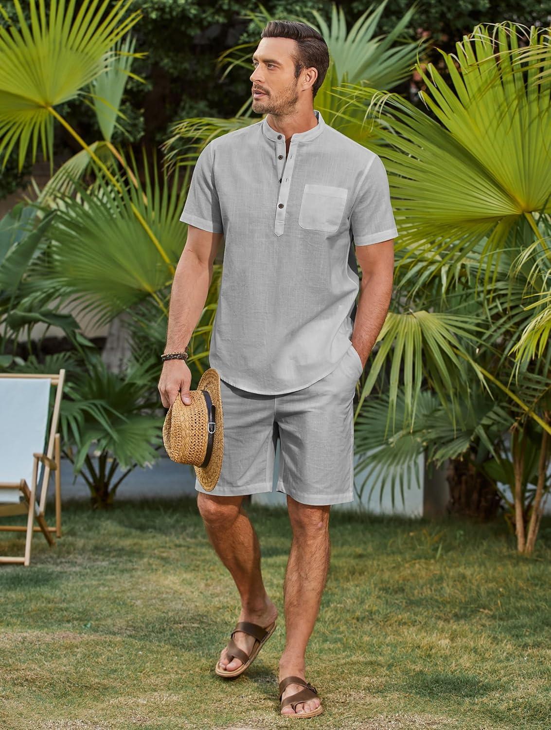 COOFANDY Men’s 2 Piece Cotton Linen Sets Summer Beach Outfits Casual Short Sleeve Henley Shirts and Vacation Shorts(Grey)