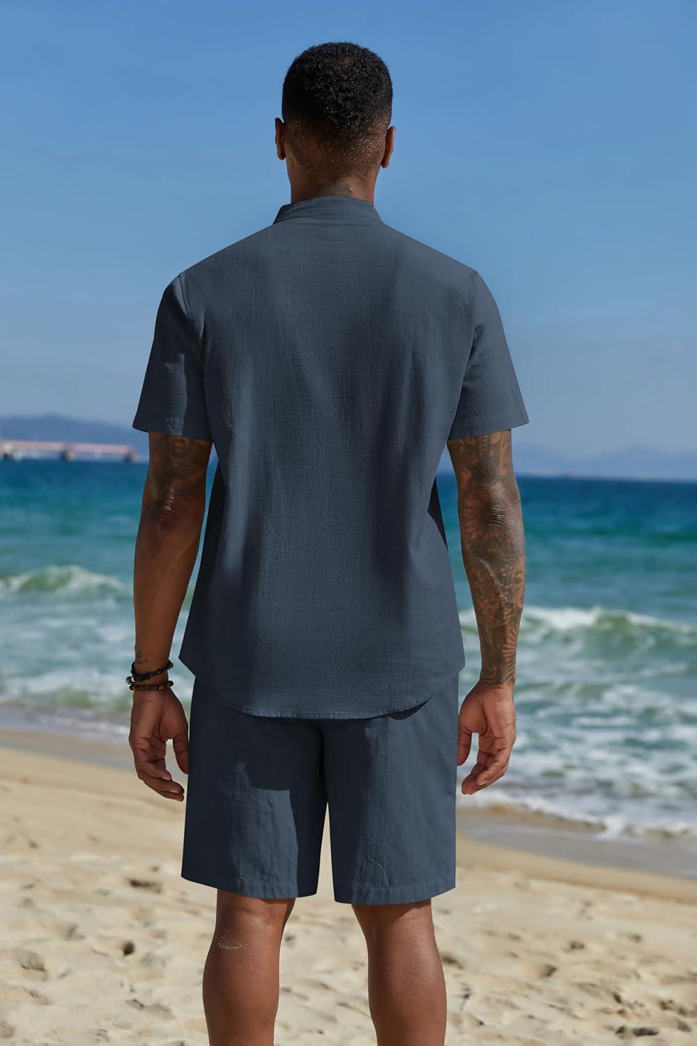 COOFANDY Men’s 2 Piece Cotton Linen Sets Summer Beach Outfits Casual Short Sleeve Henley Shirts and Vacation Shorts(Navy Blue)