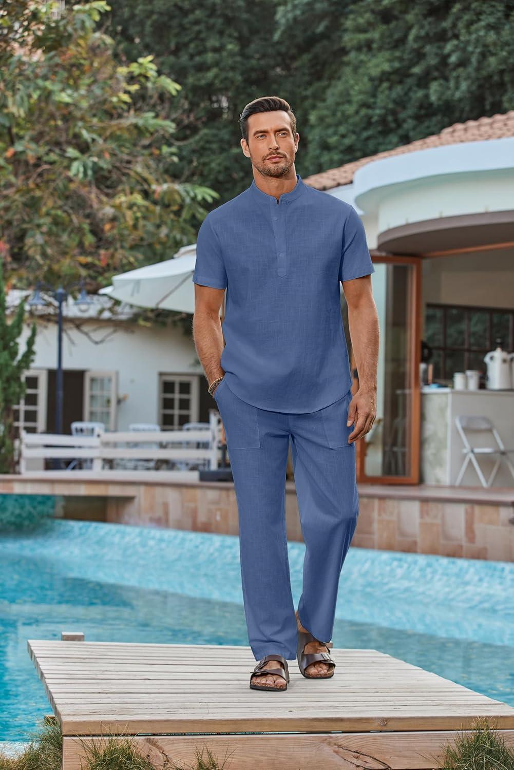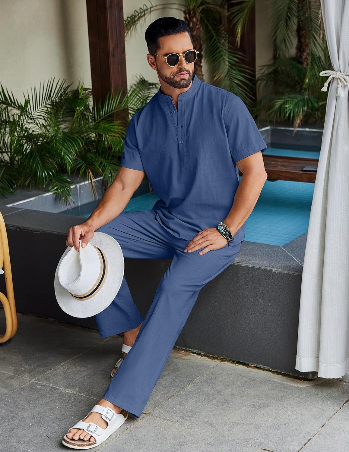COOFANDY Men’s 2 Piece Cotton Sets Casual Short Sleeve Henley Shirts and Beach Pants with Pockets Summer Vacation Outfits(Denim Blue)
