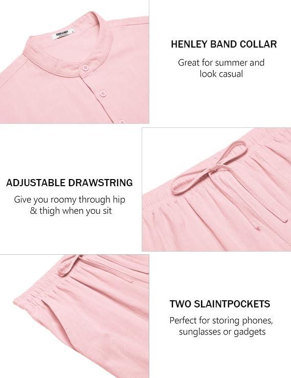 COOFANDY Men’s 2 Piece Cotton Sets Casual Short Sleeve Henley Shirts and Beach Pants with Pockets Summer Vacation Outfits(Pink)
