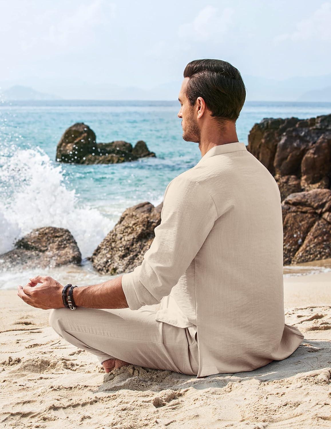 COOFANDY Men’s 2 Piece Linen Set Long Sleeve Henley Shirts Casual Beach Pants With Pockets Summer Yoga Outfits(Beige)