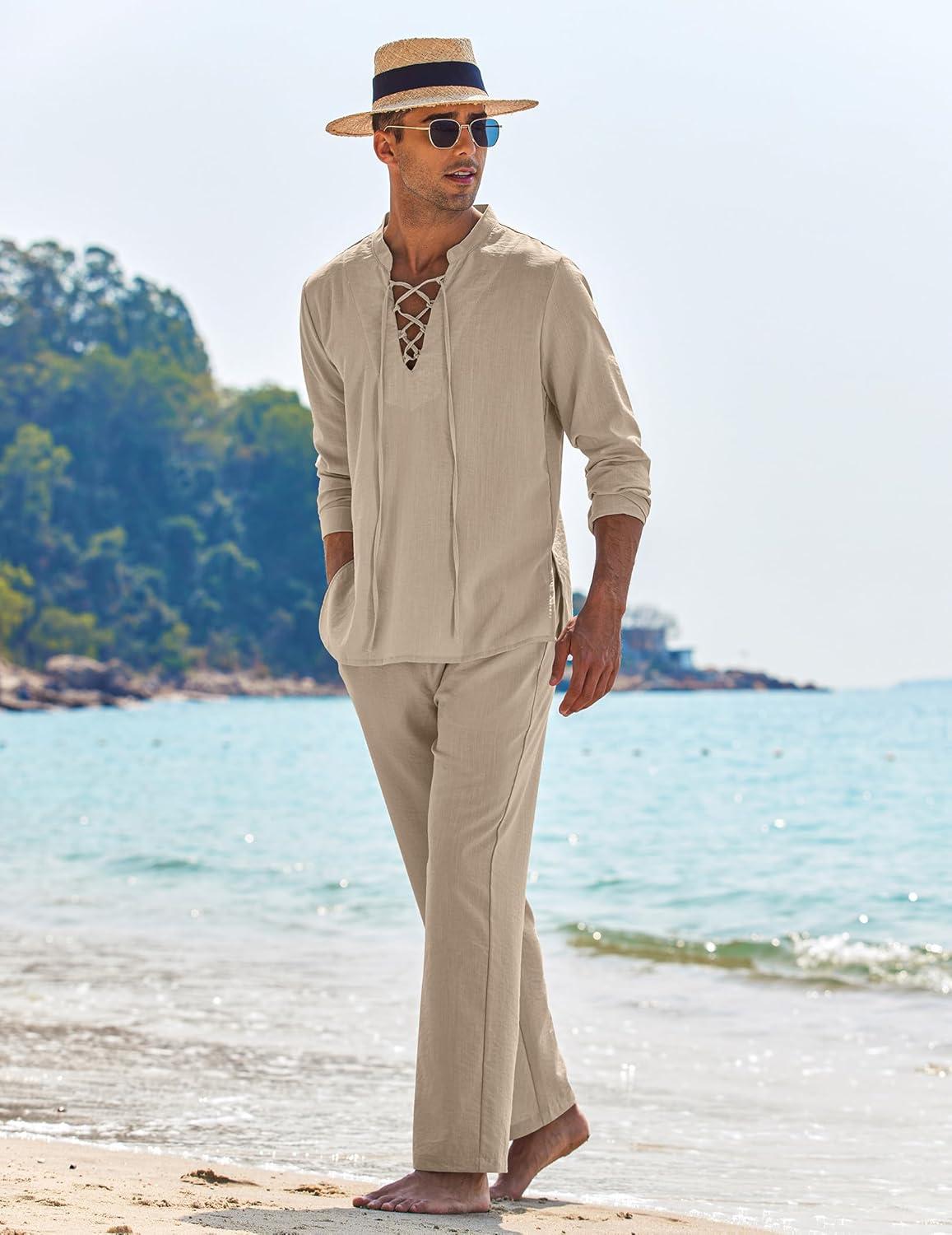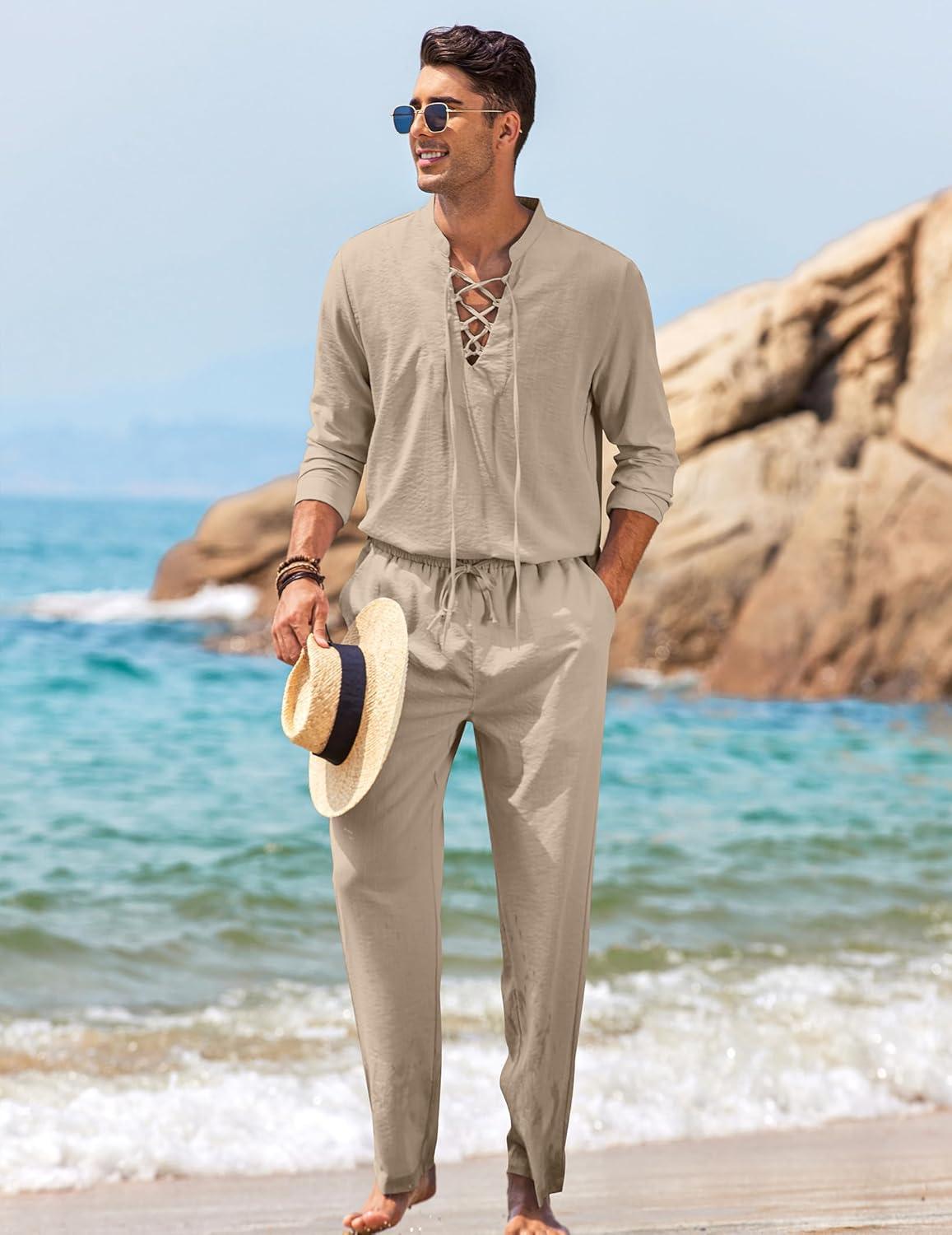 COOFANDY Men’s 2 Piece Linen Set Long Sleeve Henley Shirts Casual Beach Pants With Pockets Summer Yoga Outfits(Khaki)