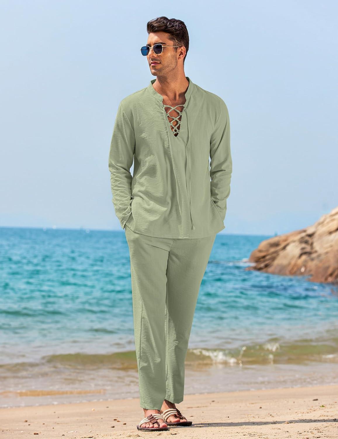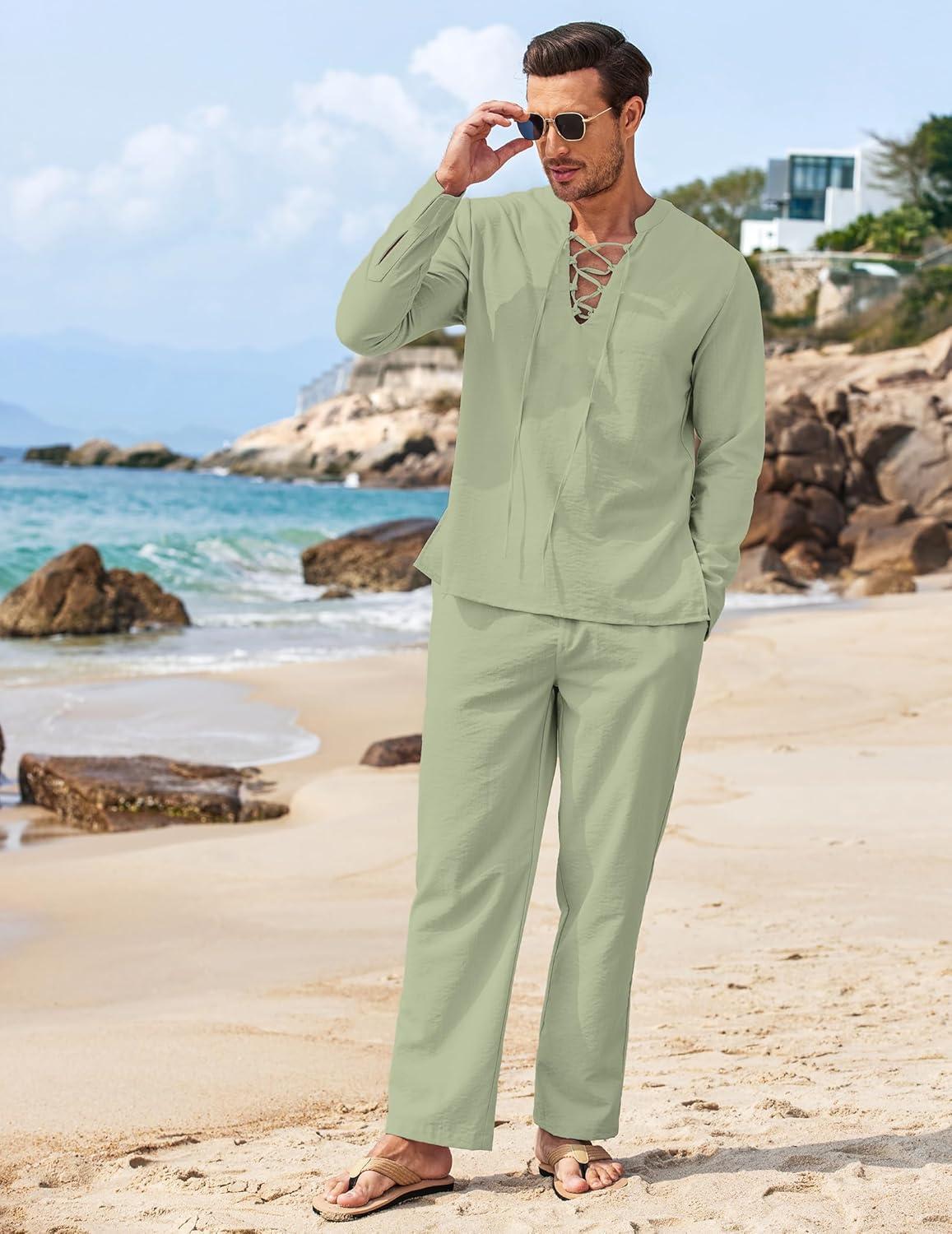 COOFANDY Men’s 2 Piece Linen Set Long Sleeve Henley Shirts Casual Beach Pants With Pockets Summer Yoga Outfits(Light Green)
