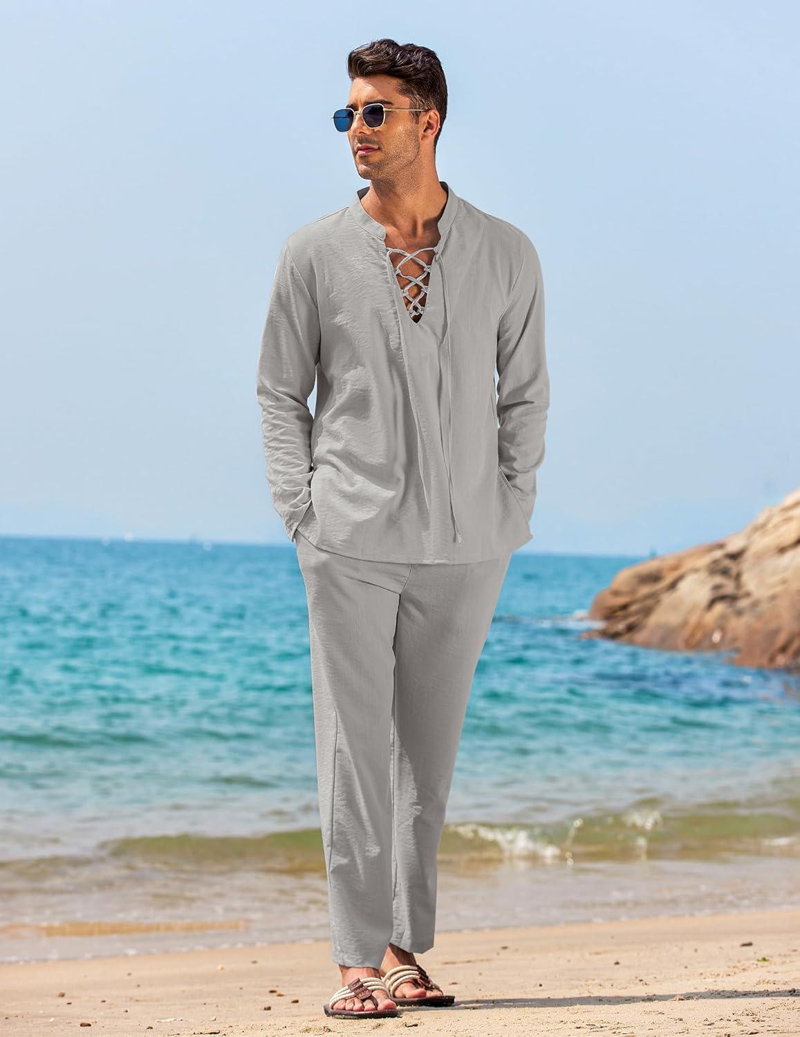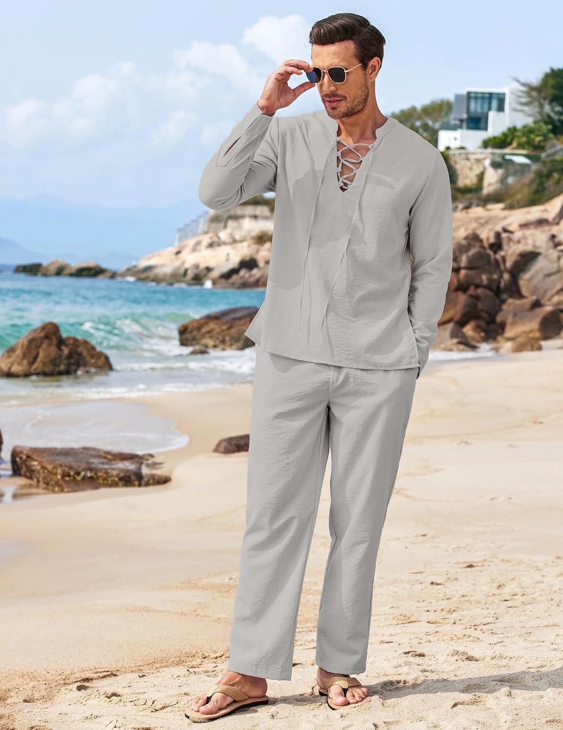 COOFANDY Men’s 2 Piece Linen Set Long Sleeve Henley Shirts Casual Beach Pants With Pockets Summer Yoga Outfits(Light Grey)