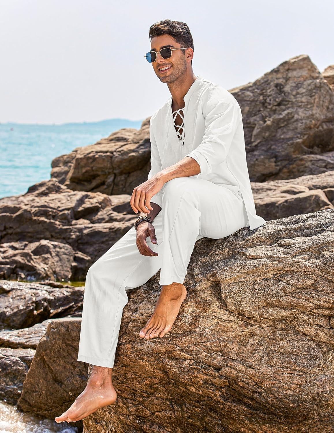 COOFANDY Men’s 2 Piece Linen Set Long Sleeve Henley Shirts Casual Beach Pants With Pockets Summer Yoga Outfits(White)