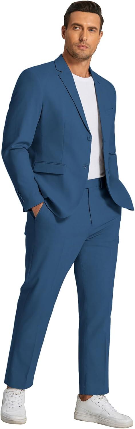 COOFANDY Men’s 2 Piece Linen Suits Set Regular Fit Casual Linen Lightweight Suit Summer Beach Wedding(Blue)