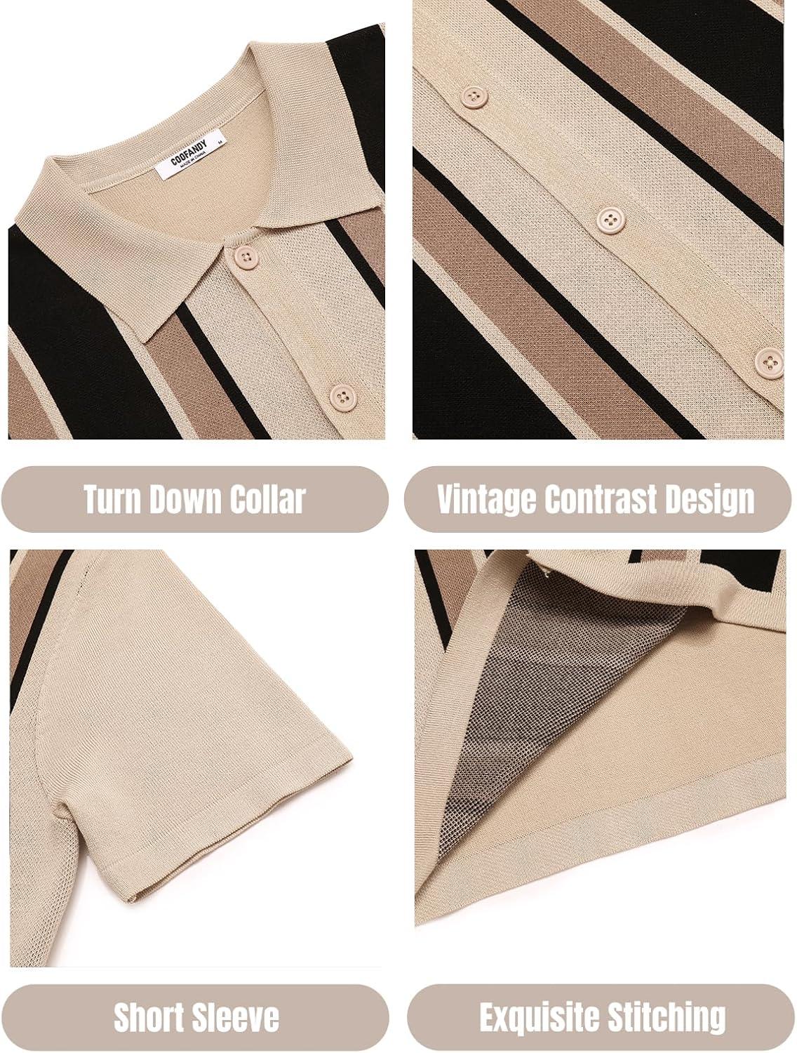 COOFANDY Men’s 2 Piece Outfit Vintage Short Sleeve Button Down Knit Polo Shirts Casual Beach Shorts Sets(Black Stripe)