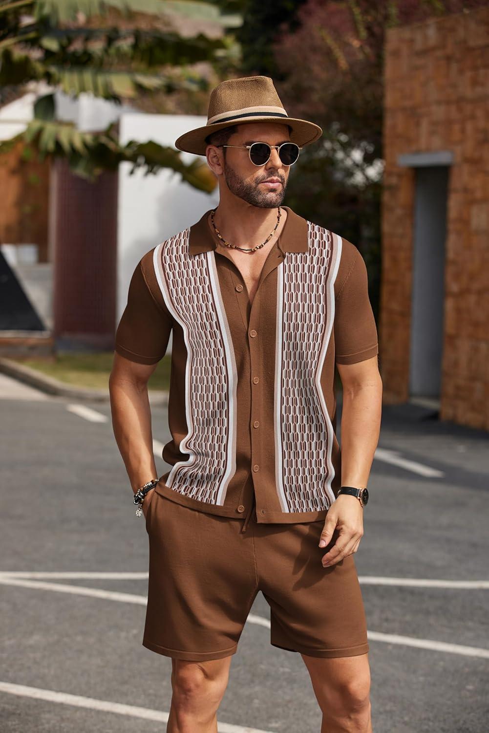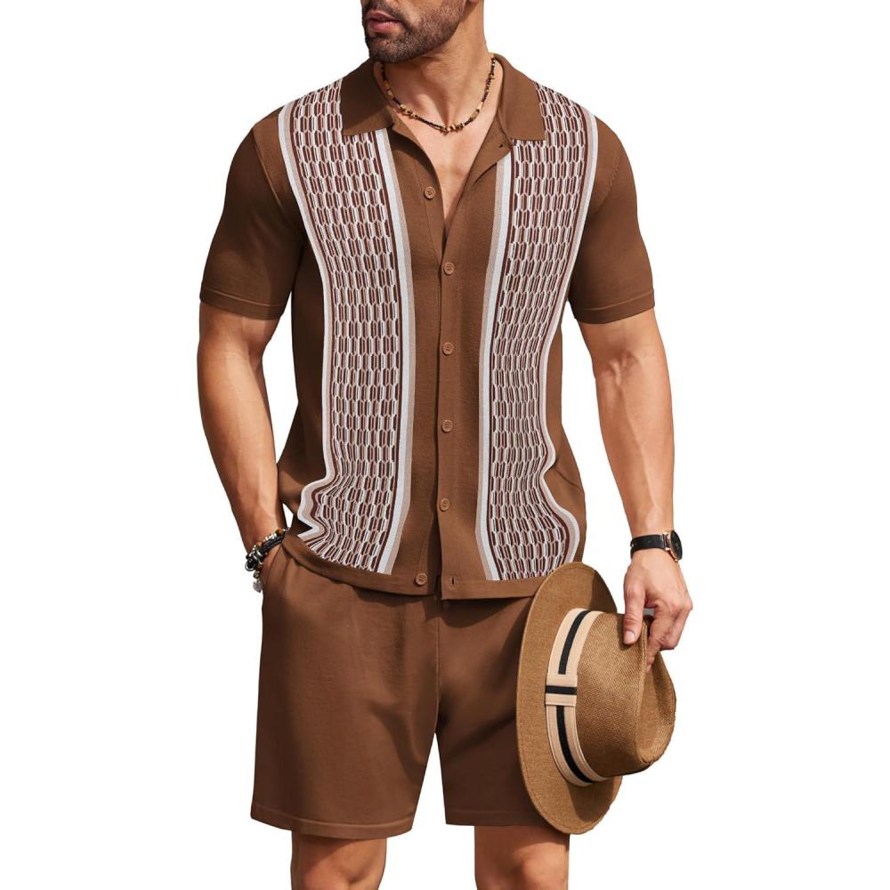 COOFANDY Men’s 2 Piece Outfit Vintage Short Sleeve Button Down Knit Polo Shirts Casual Beach Shorts Sets(Brown)