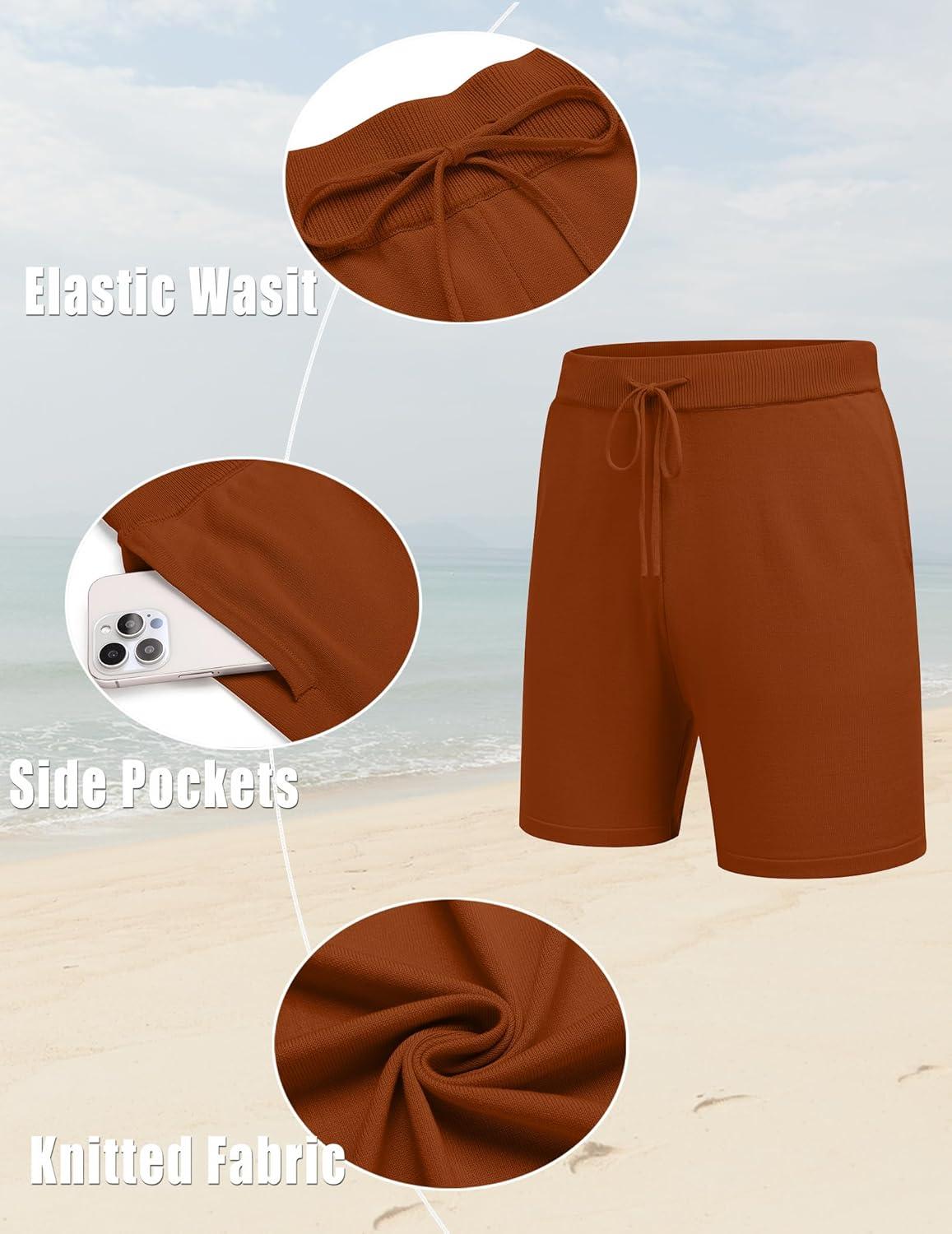 COOFANDY Men’s 2 Piece Outfit Vintage Short Sleeve Button Down Knit Polo Shirts Casual Beach Shorts Sets(Caramel)