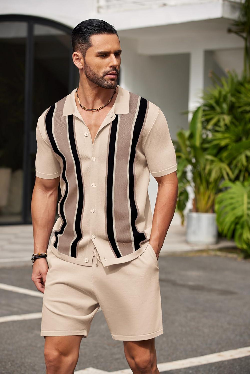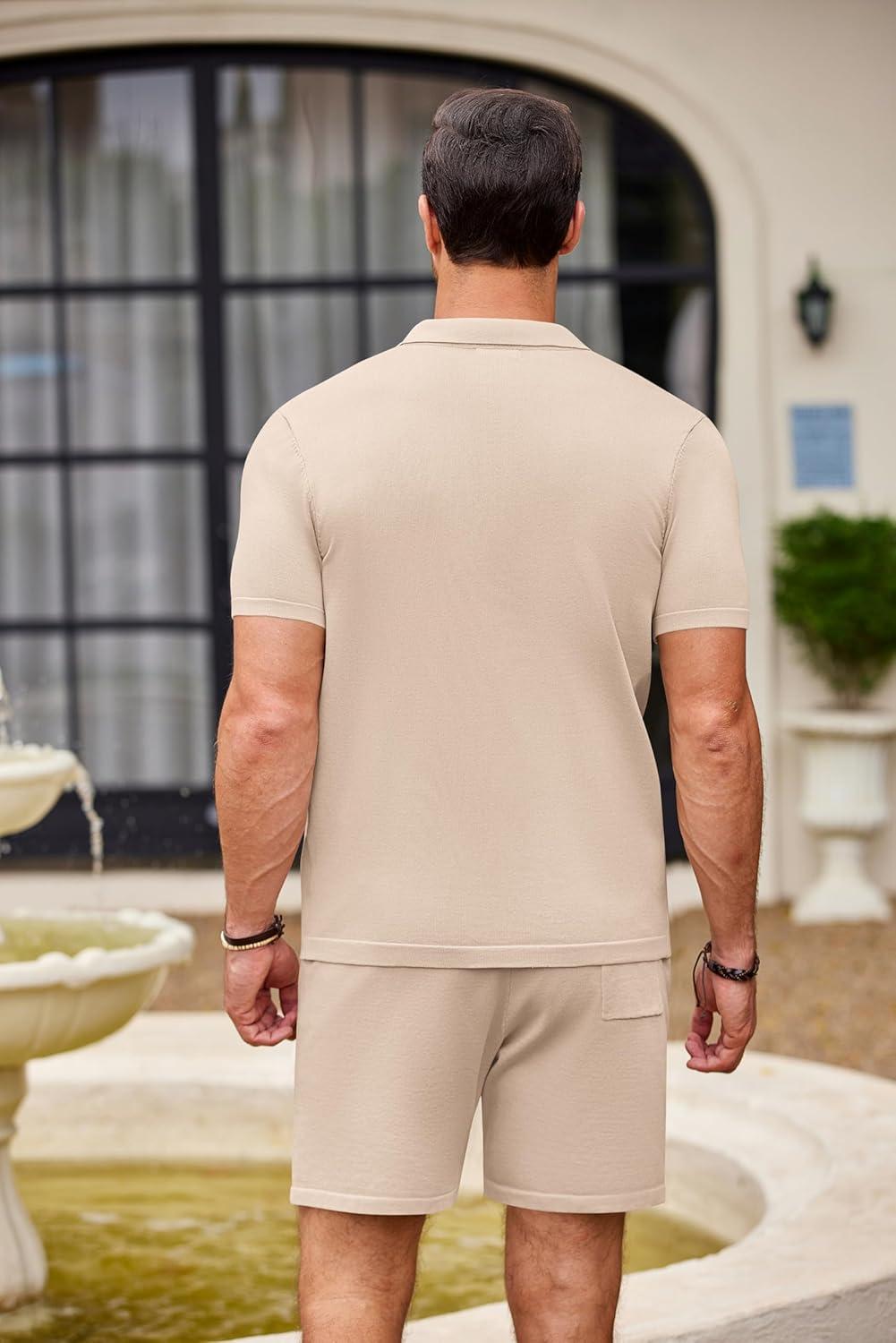 COOFANDY Men’s 2 Piece Outfit Vintage Short Sleeve Button Down Knit Polo Shirts Casual Beach Shorts Sets(Khaki & Black)