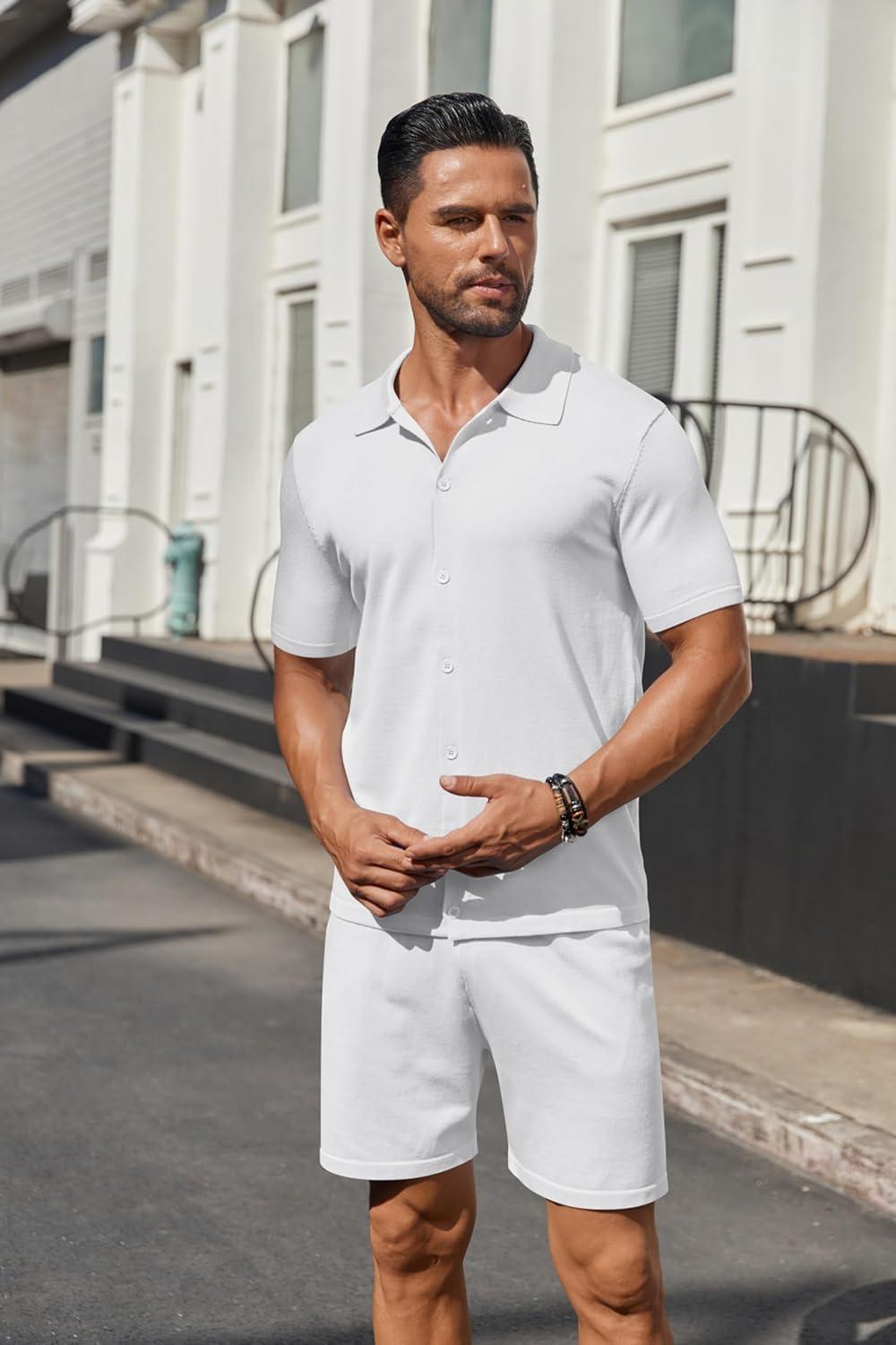 COOFANDY Men’s 2 Piece Outfit Vintage Short Sleeve Button Down Knit Polo Shirts Casual Beach Shorts Sets(White)