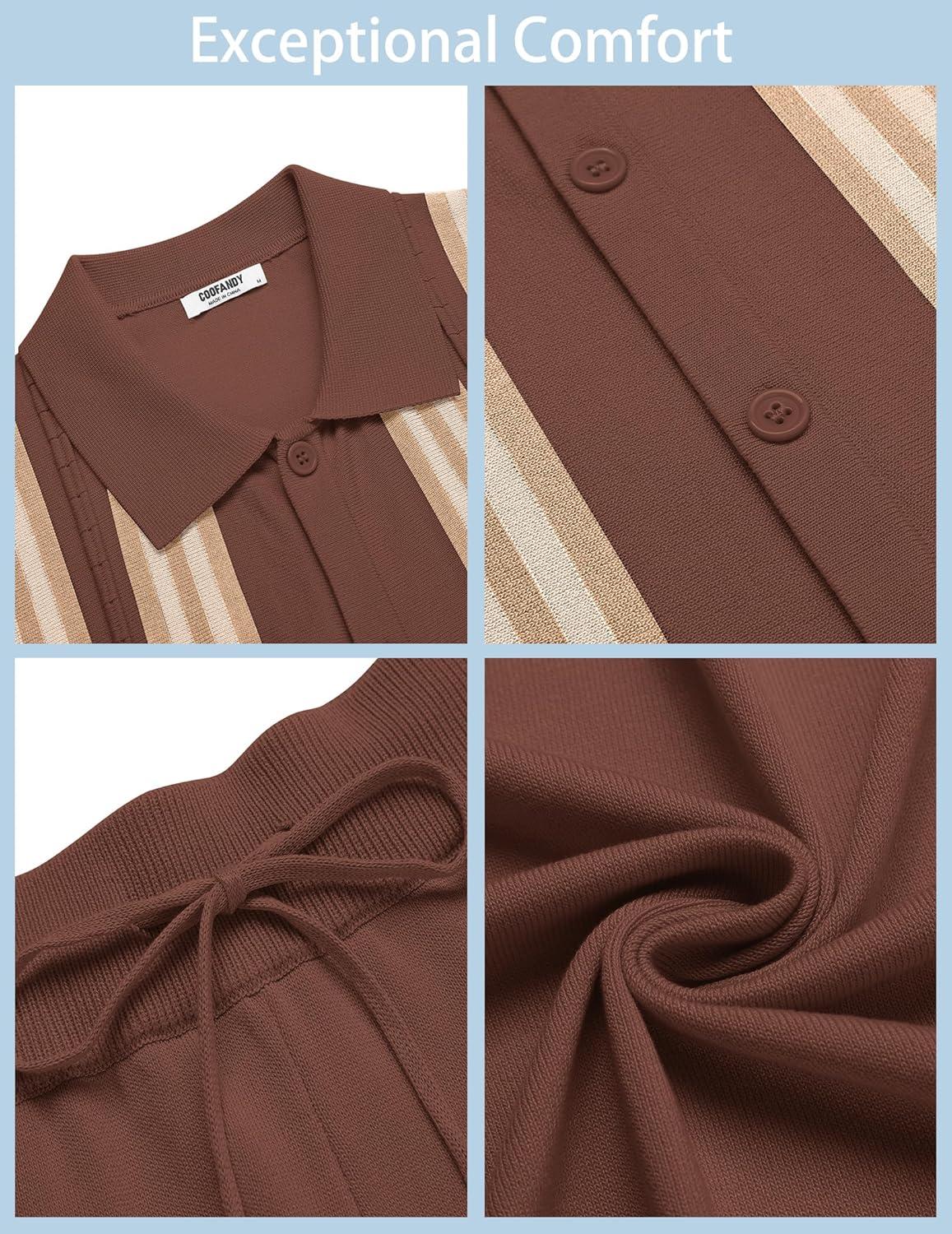 COOFANDY Men’s 2 Piece Outfits Summer Short Sets Vintage Knit Button Down Shirt Short Sleeve Polo Casual Beach Suits(Brown)