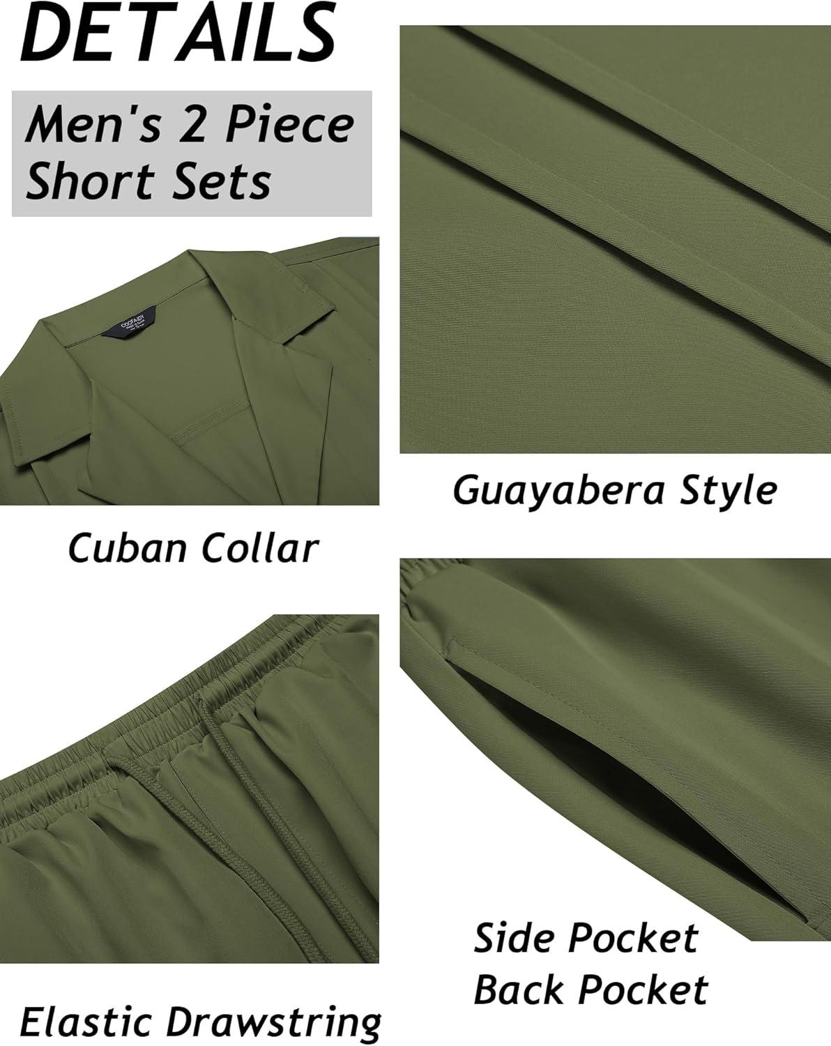 COOFANDY Mens 2 Piece Short Set Guayabera Button Down Shirt Casual Summer Beach Outfits(Army Green)