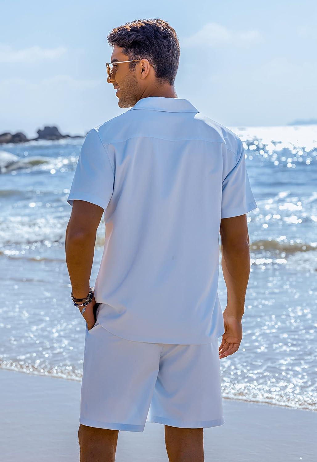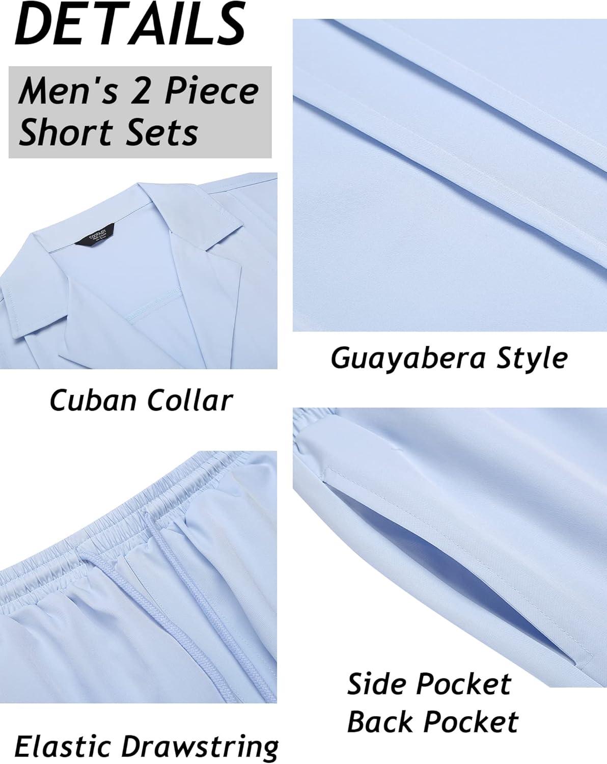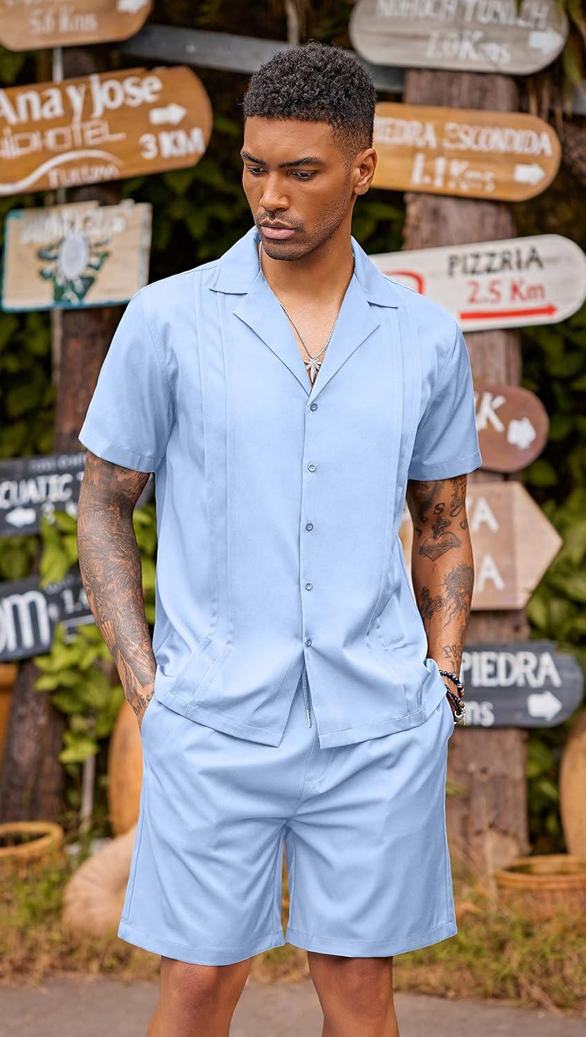 COOFANDY Mens 2 Piece Short Set Guayabera Button Down Shirt Casual Summer Beach Outfits(Light Blue)