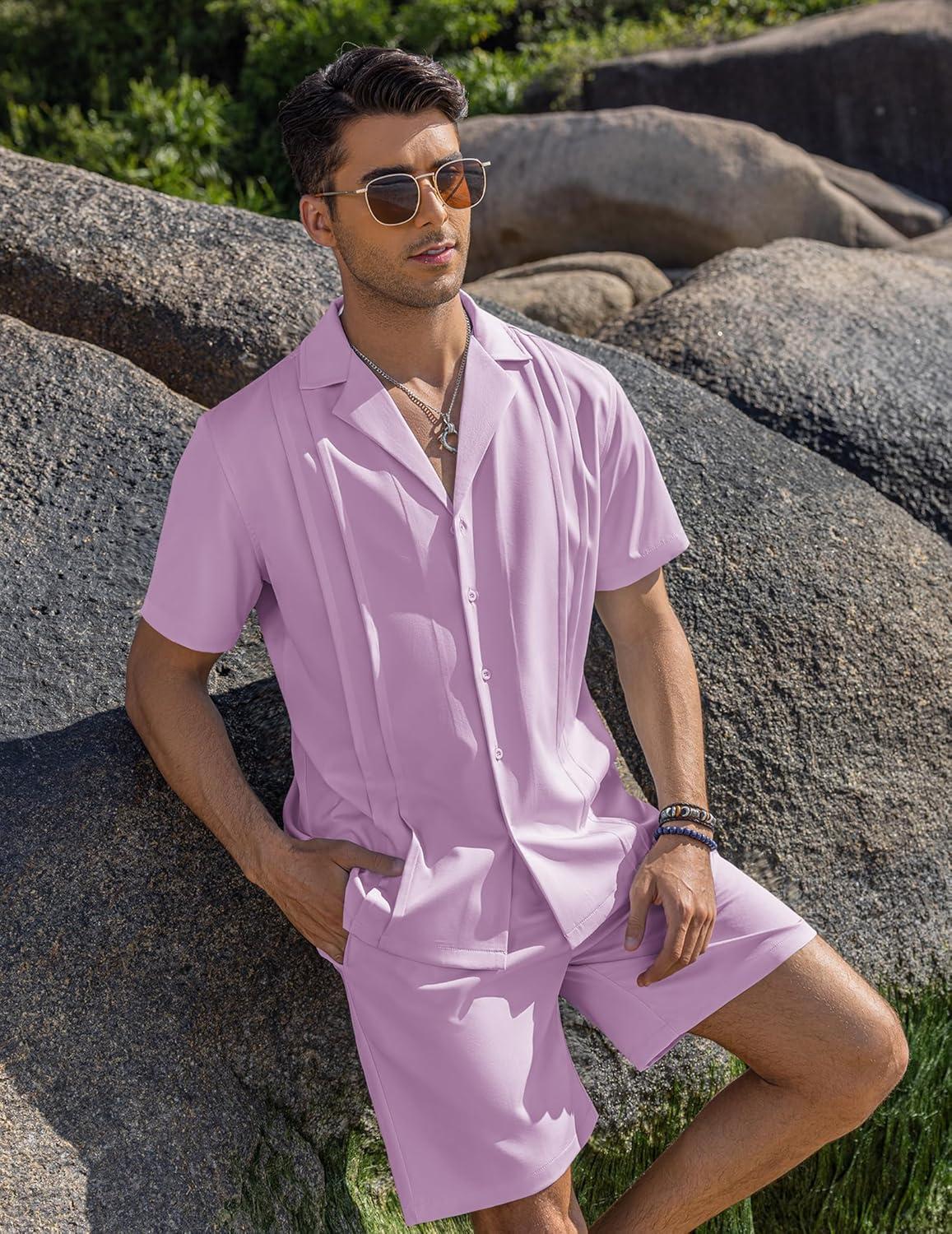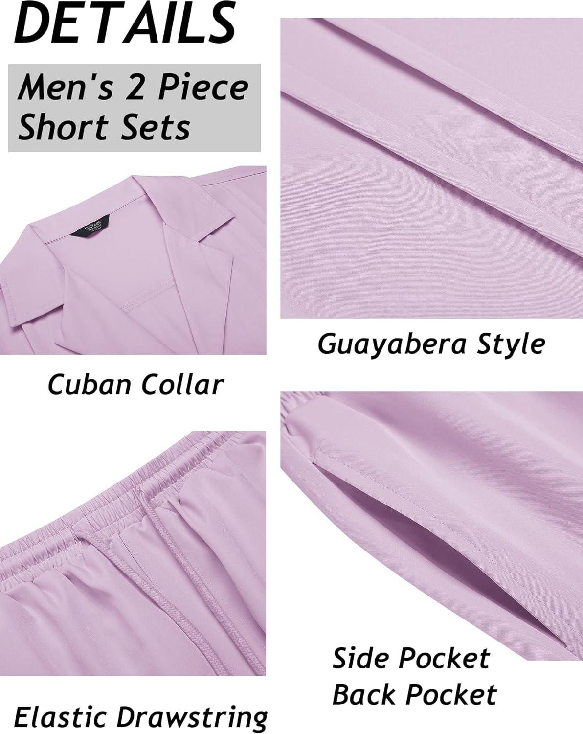 COOFANDY Mens 2 Piece Short Set Guayabera Button Down Shirt Casual Summer Beach Outfits(Purple)