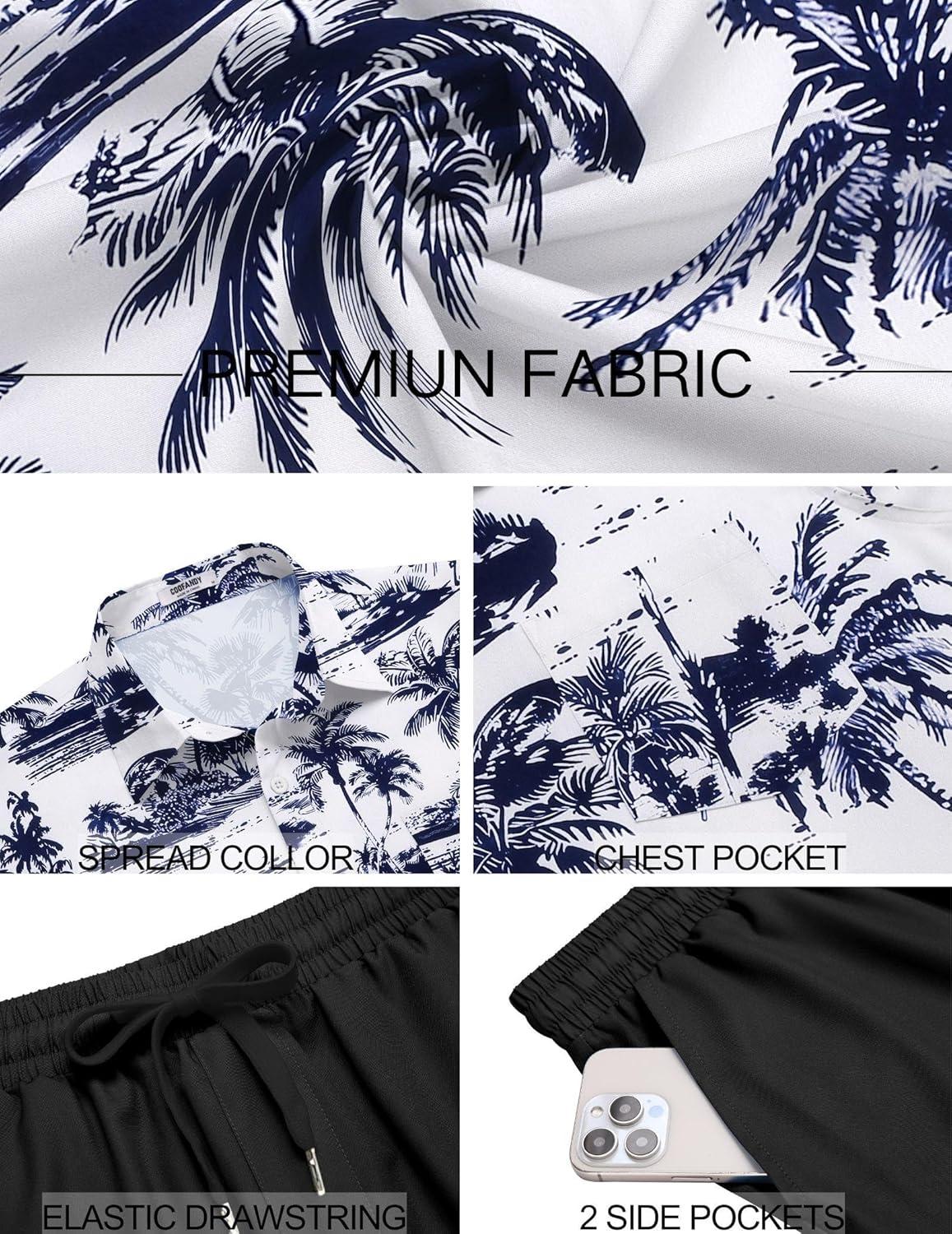 COOFANDY Men’s 2 Piece Summer Beach Outfits Tropical Short Sleeve Button Down Shirts and Shorts Hawaiian Vacation Sets(Navy Palm Leaf)