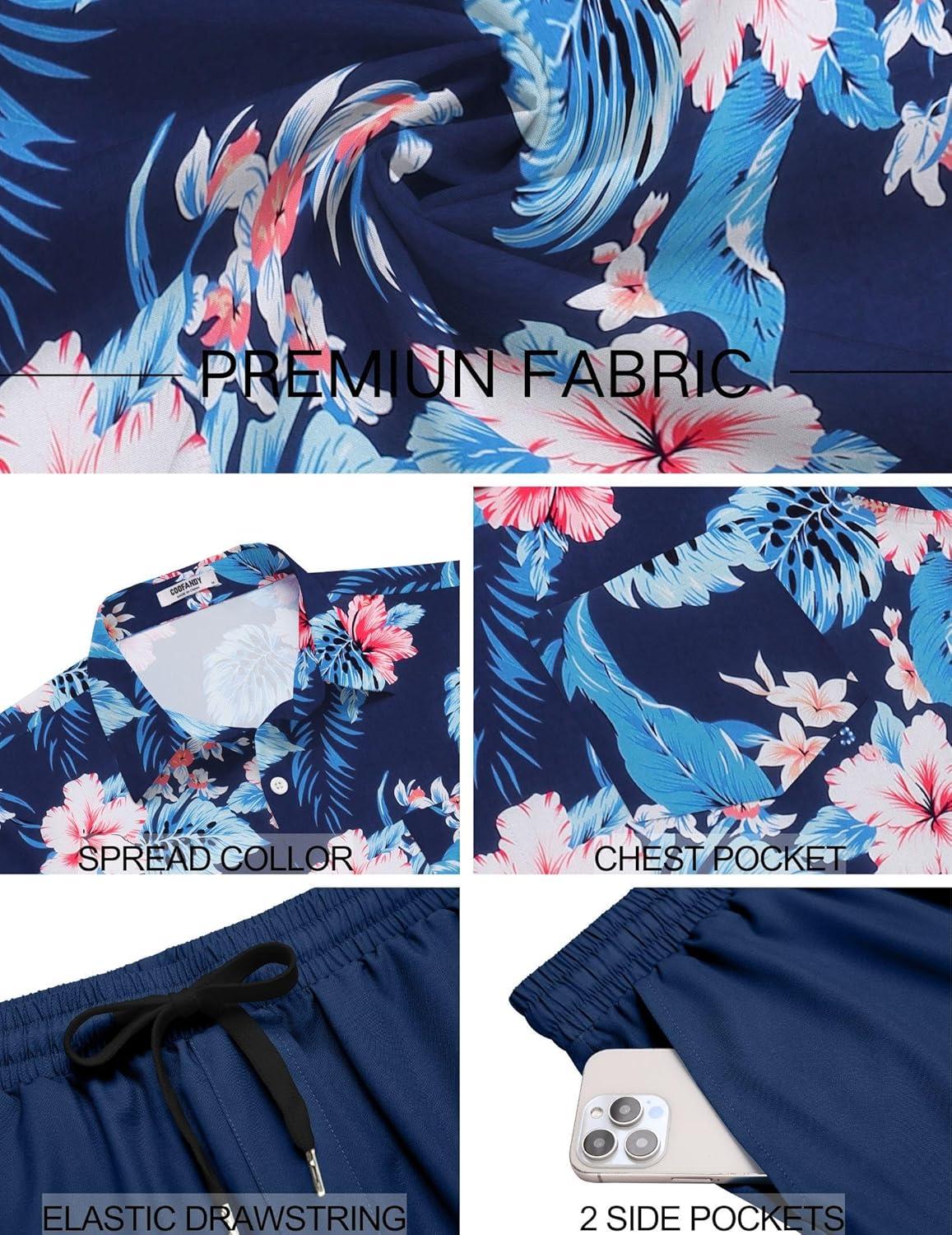 COOFANDY Men’s 2 Piece Summer Beach Outfits Tropical Short Sleeve Button Down Shirts and Shorts Hawaiian Vacation Sets(Navy Tropical Floral)
