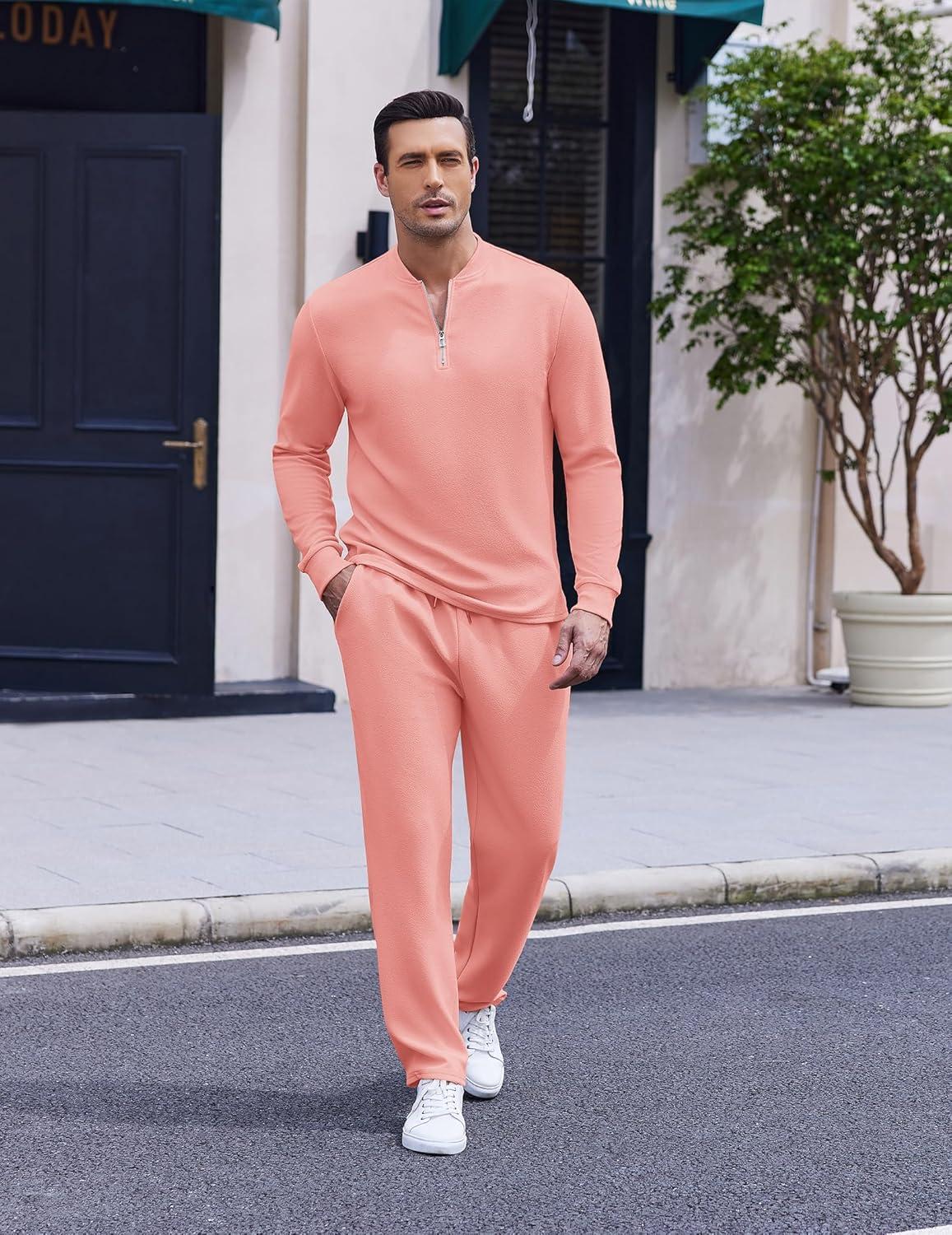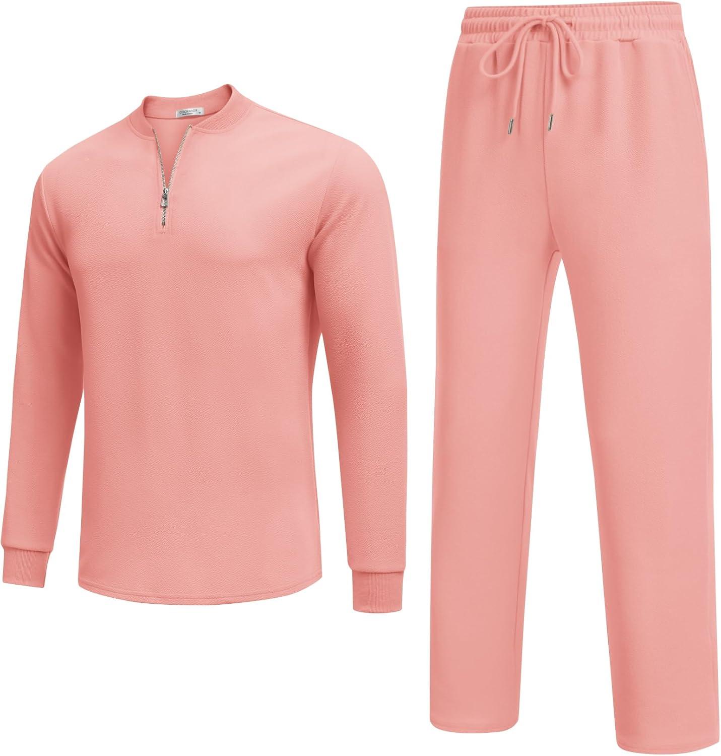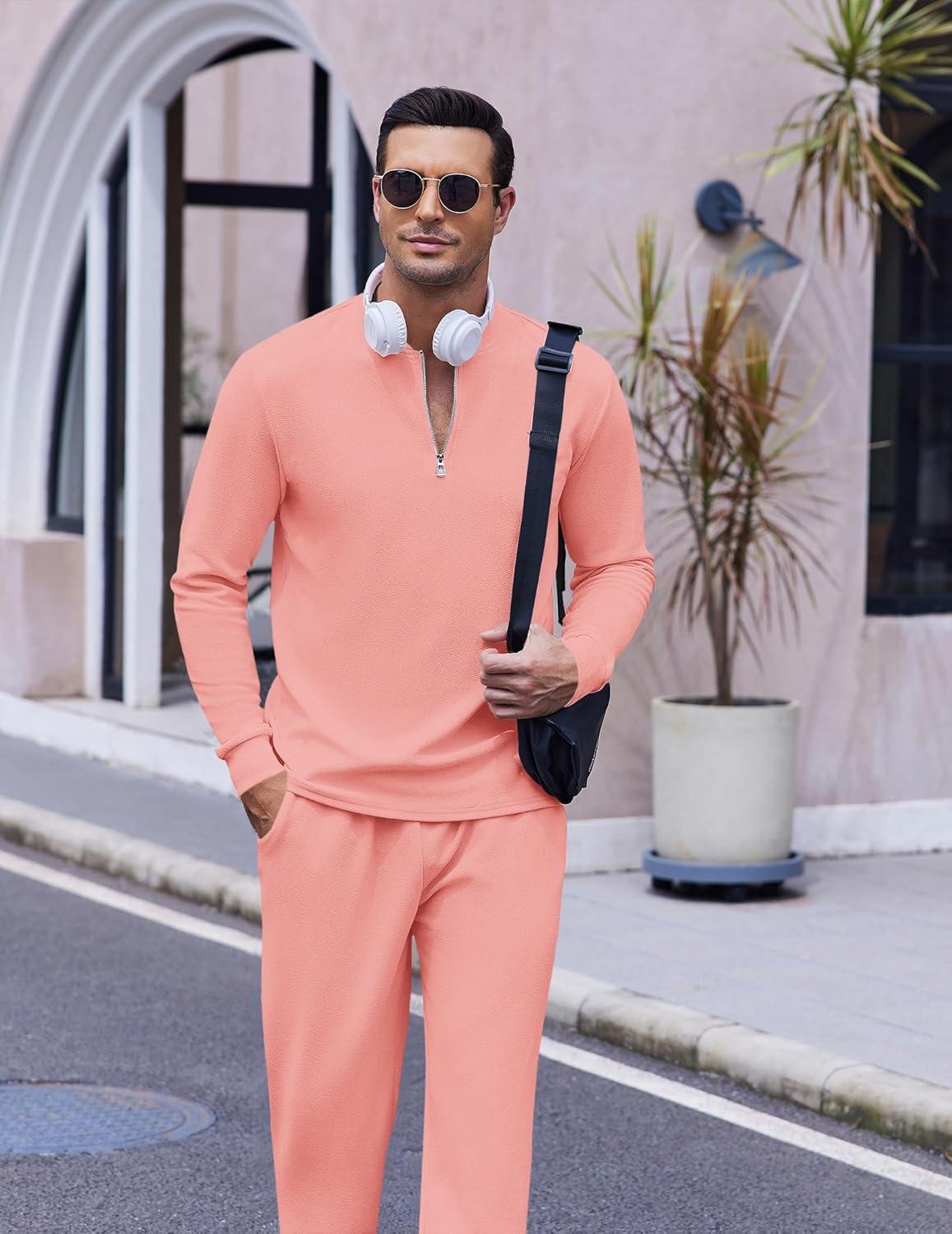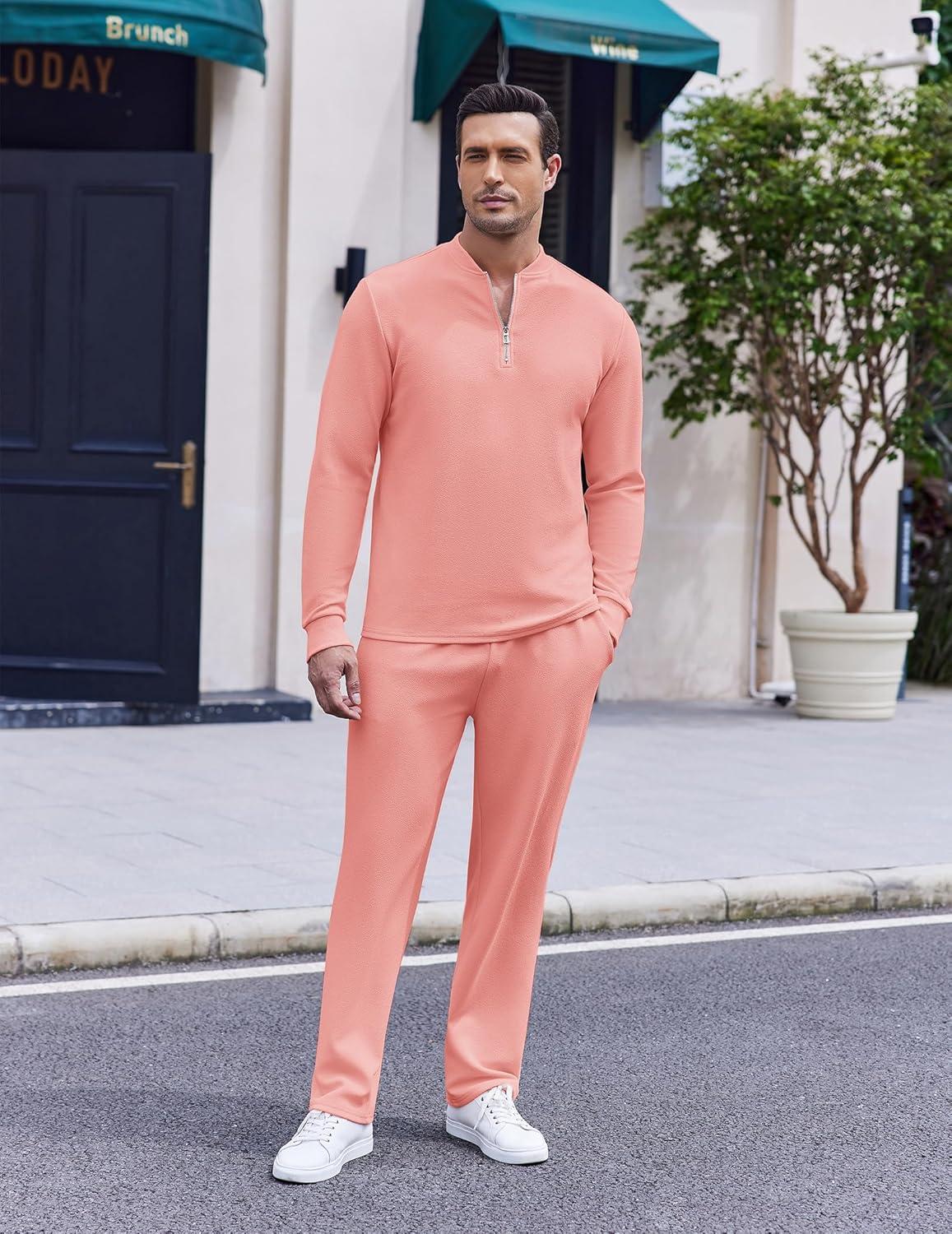 COOFANDY Men’s 2 Piece Tracksuit Set Polo Athletic Sweatsuit Quarter Zip Jogging Long Sleeve Casual Sports Outfits(Pink)