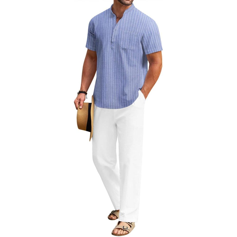 COOFANDY Men’s 2 Pieces Cotton Linen Set Casual Short Sleeve Henley Shirts Beach Yoga Pants Summer Outfits(Blue Striped)