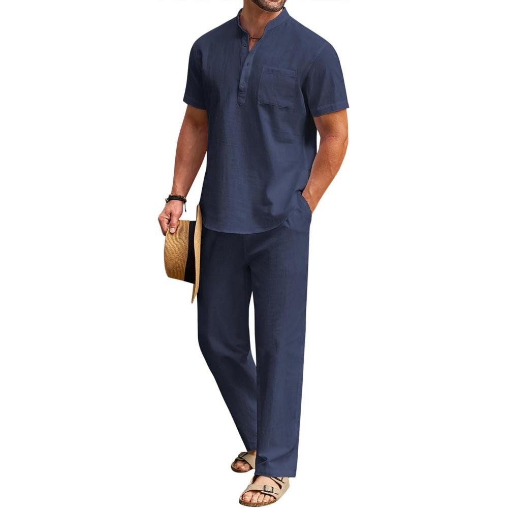 COOFANDY Men’s 2 Pieces Cotton Linen Set Casual Short Sleeve Henley Shirts Beach Yoga Pants Summer Outfits(Navy Blue)