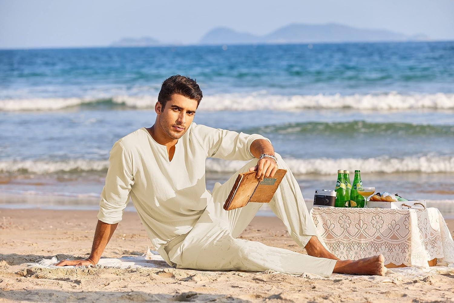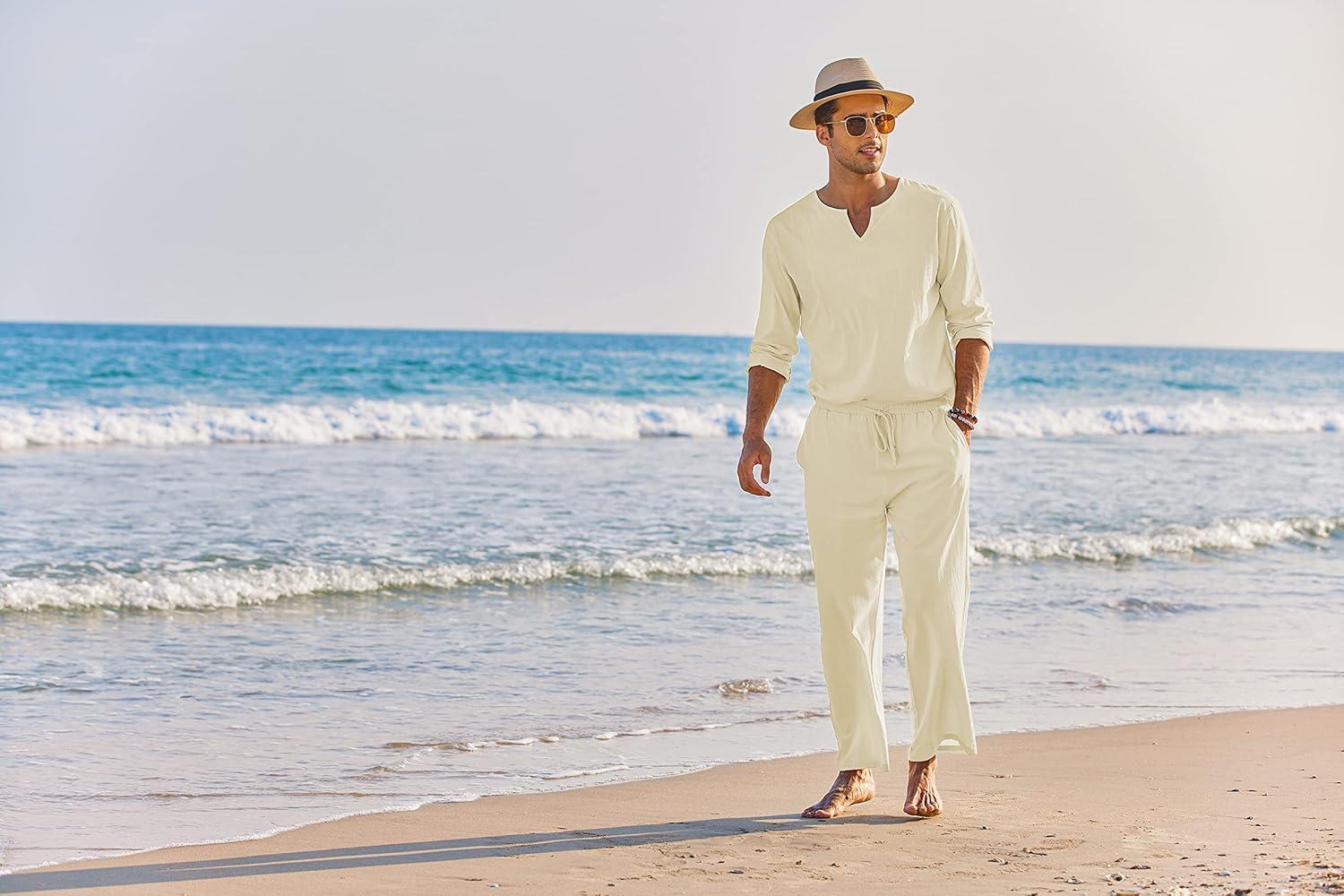 COOFANDY Men’s 2 Pieces Cotton Linen Set Henley Shirt Long Sleeve and Casual Beach Pants Summer Yoga Outfits(Light Khaki)