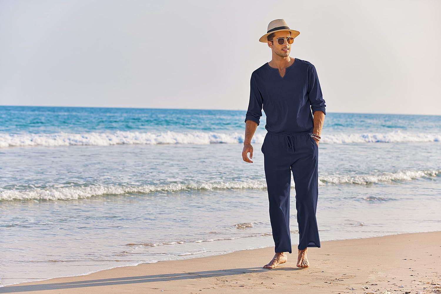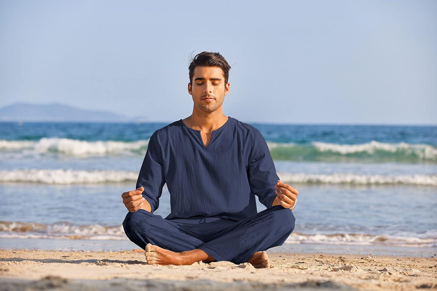 COOFANDY Men’s 2 Pieces Cotton Linen Set Henley Shirt Long Sleeve and Casual Beach Pants Summer Yoga Outfits(Navy Blue)