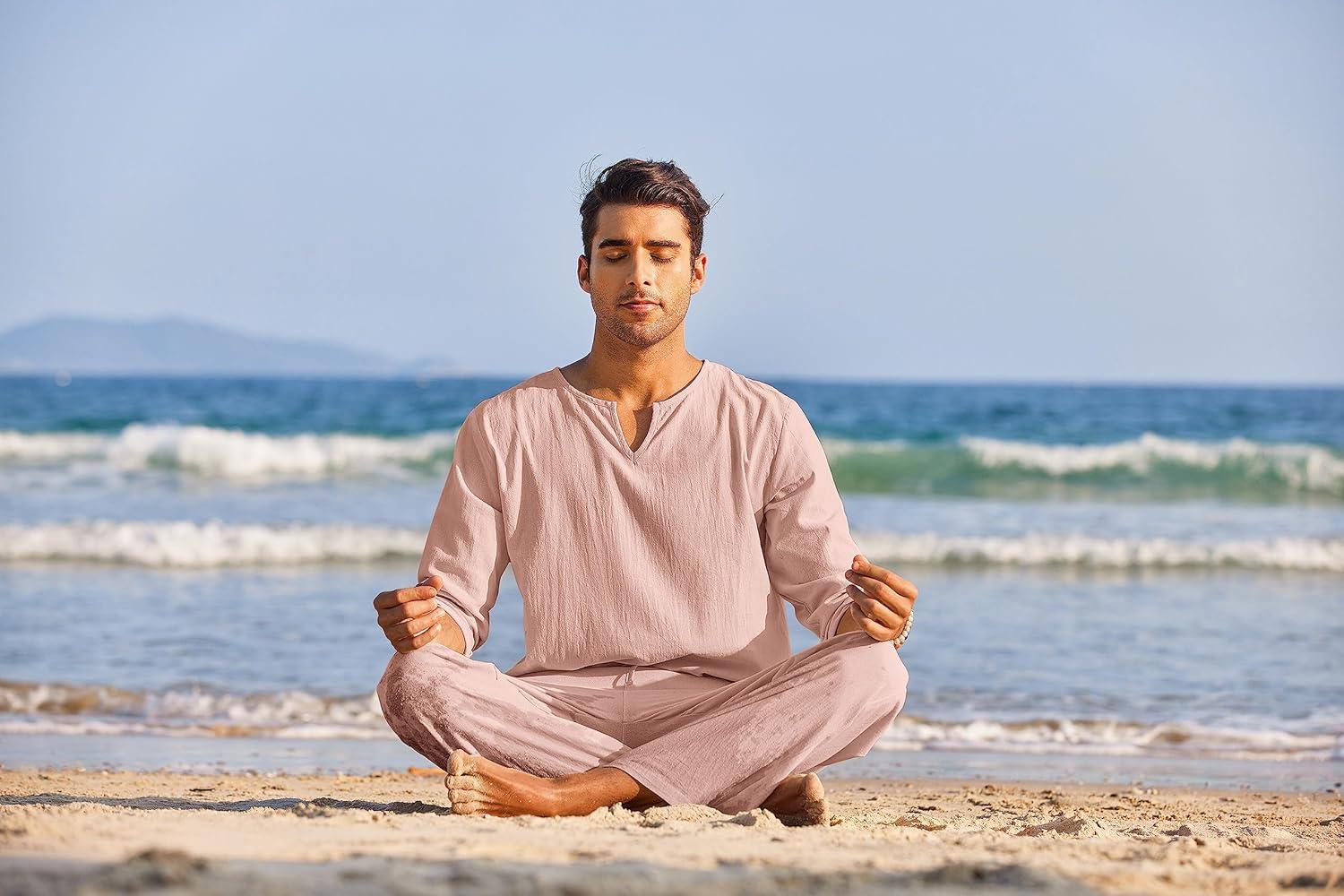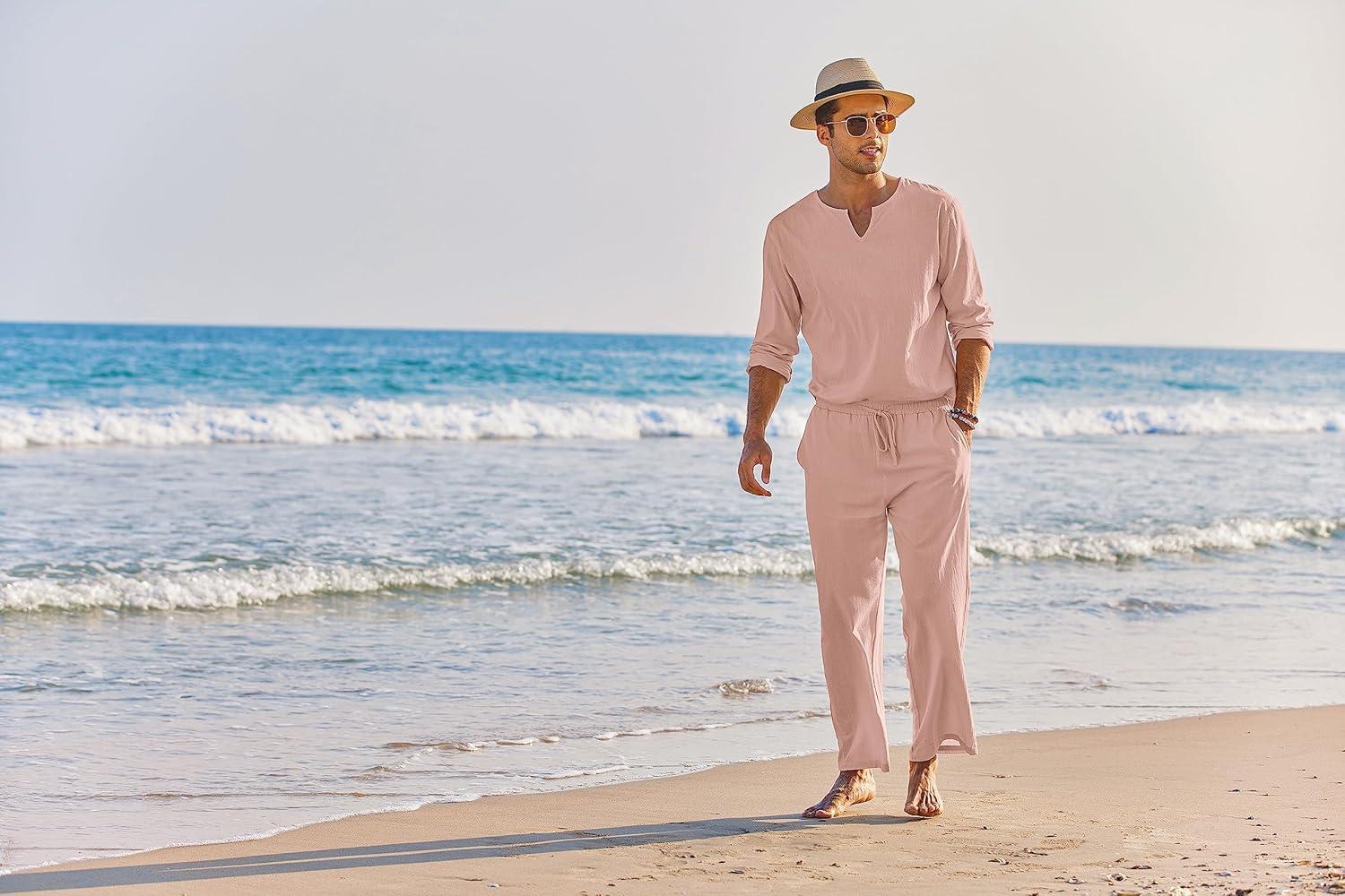 COOFANDY Men’s 2 Pieces Cotton Linen Set Henley Shirt Long Sleeve and Casual Beach Pants Summer Yoga Outfits(Pink)