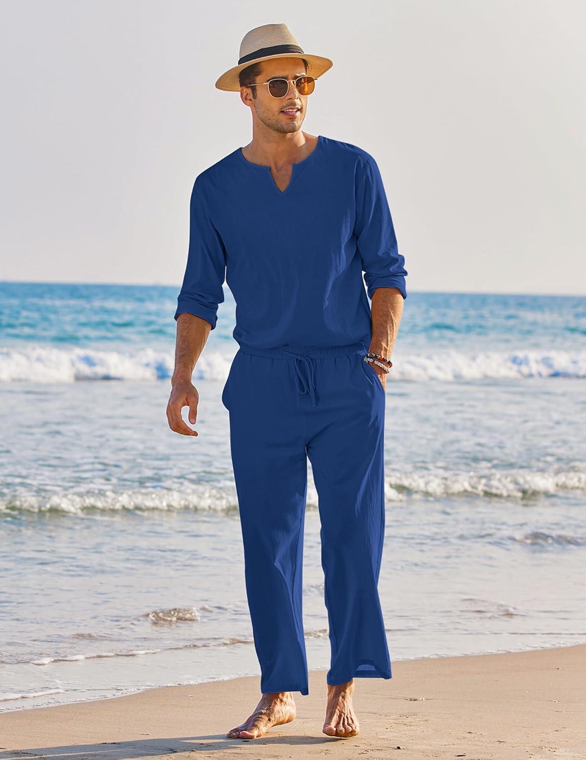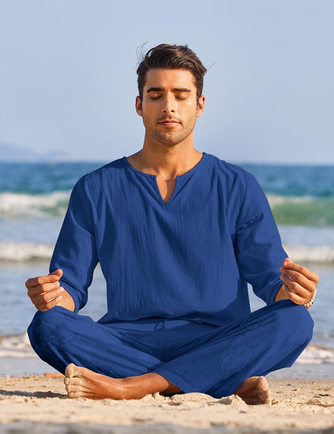 COOFANDY Men’s 2 Pieces Cotton Linen Set Henley Shirt Long Sleeve and Casual Beach Pants Summer Yoga Outfits(Royal Blue)