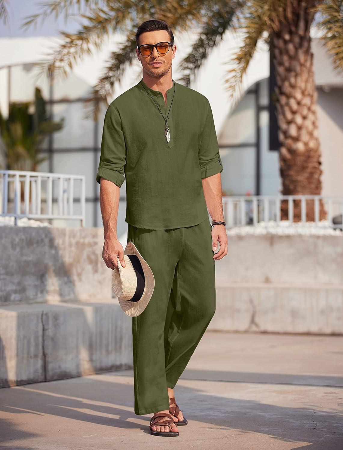COOFANDY Men’s 2 Pieces Cotton Linen Set Long Sleeve Henley Shirts Casual Beach Pants With Pockets Summer Yoga Outfits(Army Green)