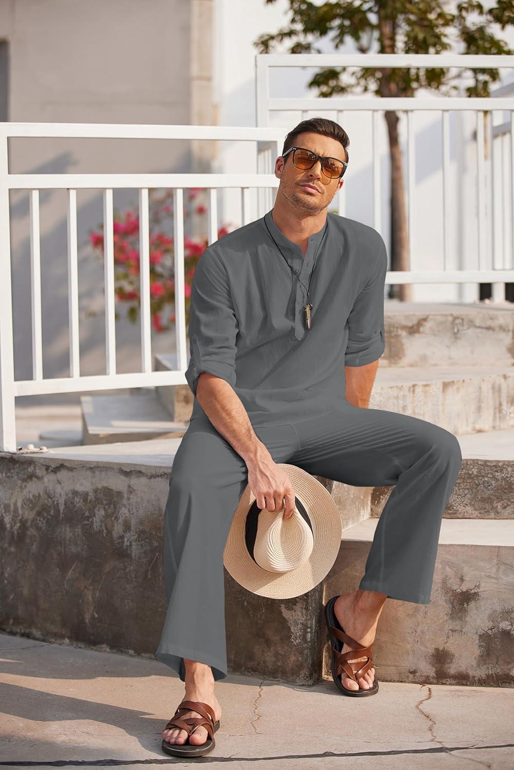 COOFANDY Men’s 2 Pieces Cotton Linen Set Long Sleeve Henley Shirts Casual Beach Pants With Pockets Summer Yoga Outfits(Dark Grey)