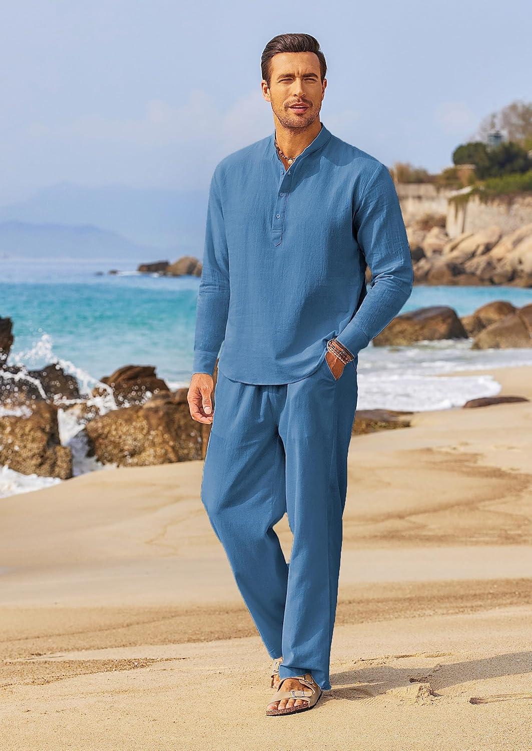 COOFANDY Men’s 2 Pieces Cotton Linen Set Long Sleeve Henley Shirts Casual Beach Pants With Pockets Summer Yoga Outfits(Denim Blue)