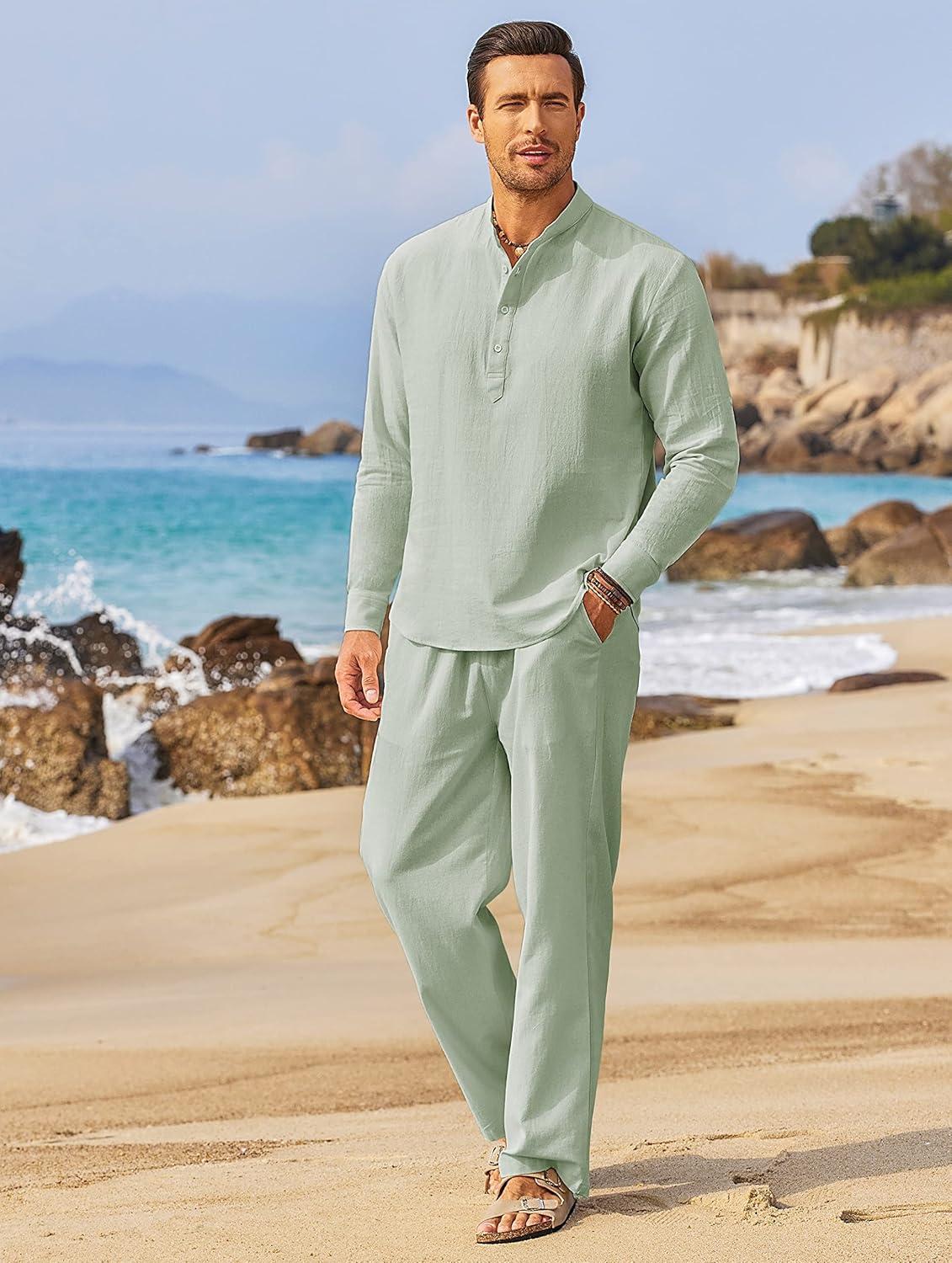 COOFANDY Men’s 2 Pieces Cotton Linen Set Long Sleeve Henley Shirts Casual Beach Pants With Pockets Summer Yoga Outfits(Light Green)