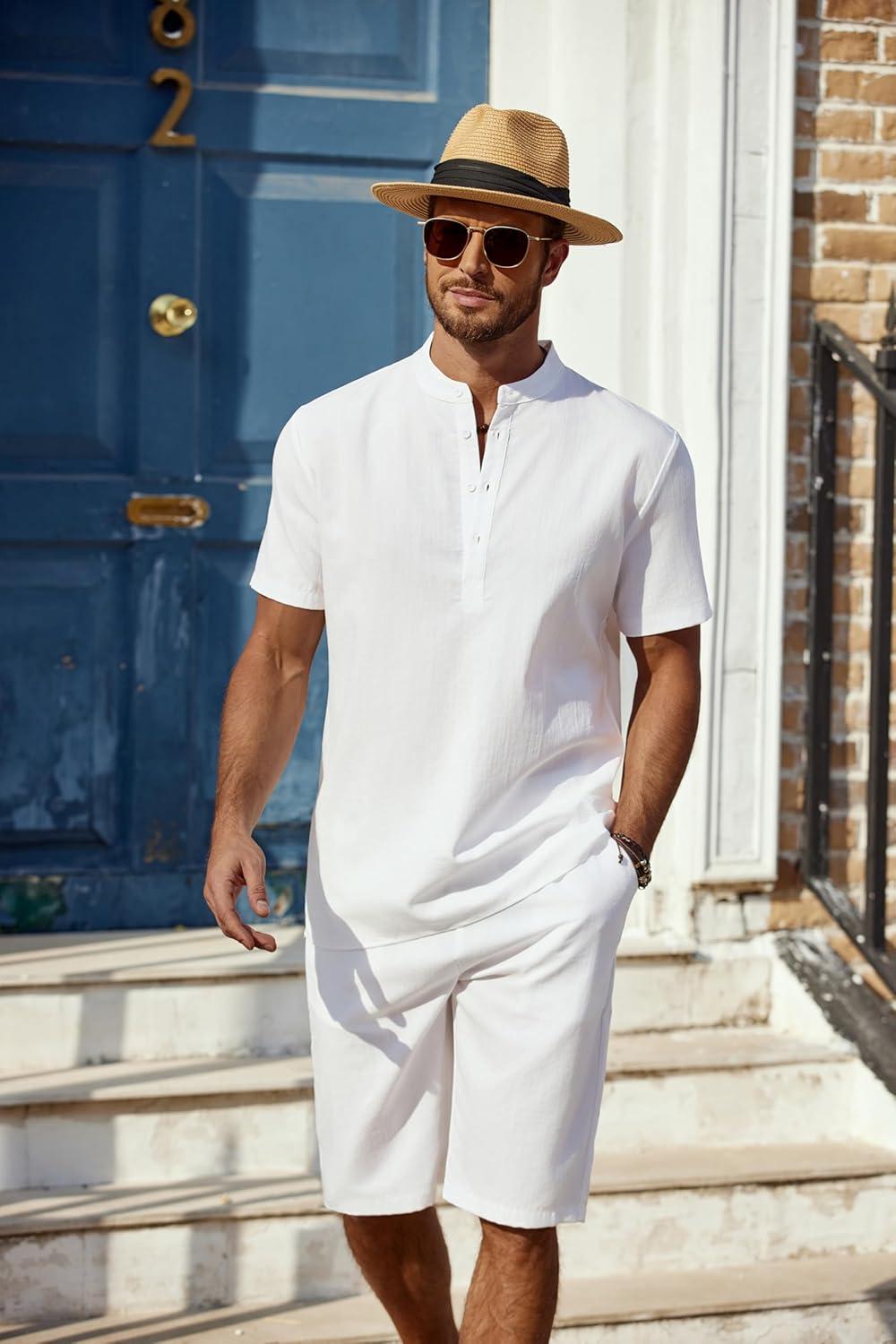 COOFANDY Men’s 2 Pieces Linen Set Casual Henley Shirts Short Sleeve Beach Yoga Shorts Summer Pants Outfits(01-white)